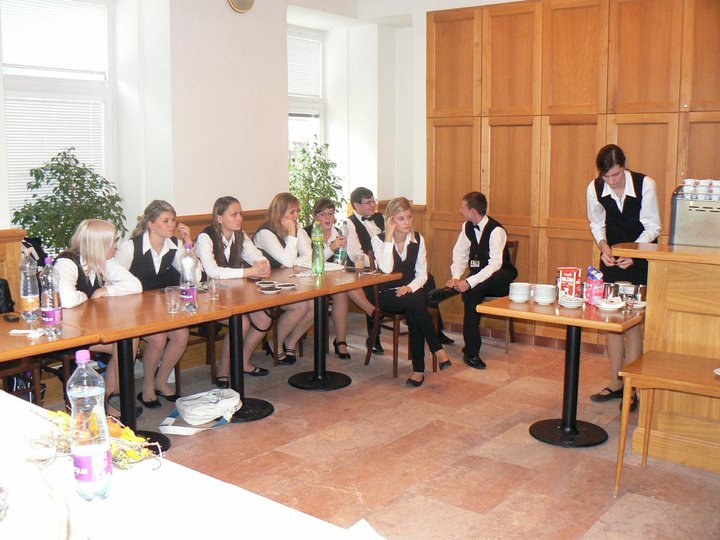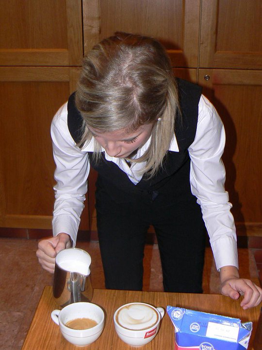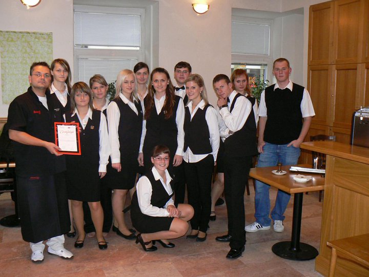 1. den jsme byli obohaceni teoretickou částí, dozvěděli jsme se plno zajímavých informací o kávě jako takové. 2. den byla dopoledne část praktická a odpoledne se 6 nejlepších účastníků kurzu utkalo v soutěži o 4 nejlepší espressa a 4 cappuccina. Na nápoje měli 10 minut, vše pozorovala 4členná porota. Hodnotila se chuť, kvalita a vzhled připravené kávy, technika soutěžícího, pořádek na pracovišti a úsměv. :-) Všechny tři místa obsadily studentky z 2.A a to na 1. místě Šárka Pleskačová, na 2. místě Hana Koštýřová a na 3. místě Denisa Voborová.