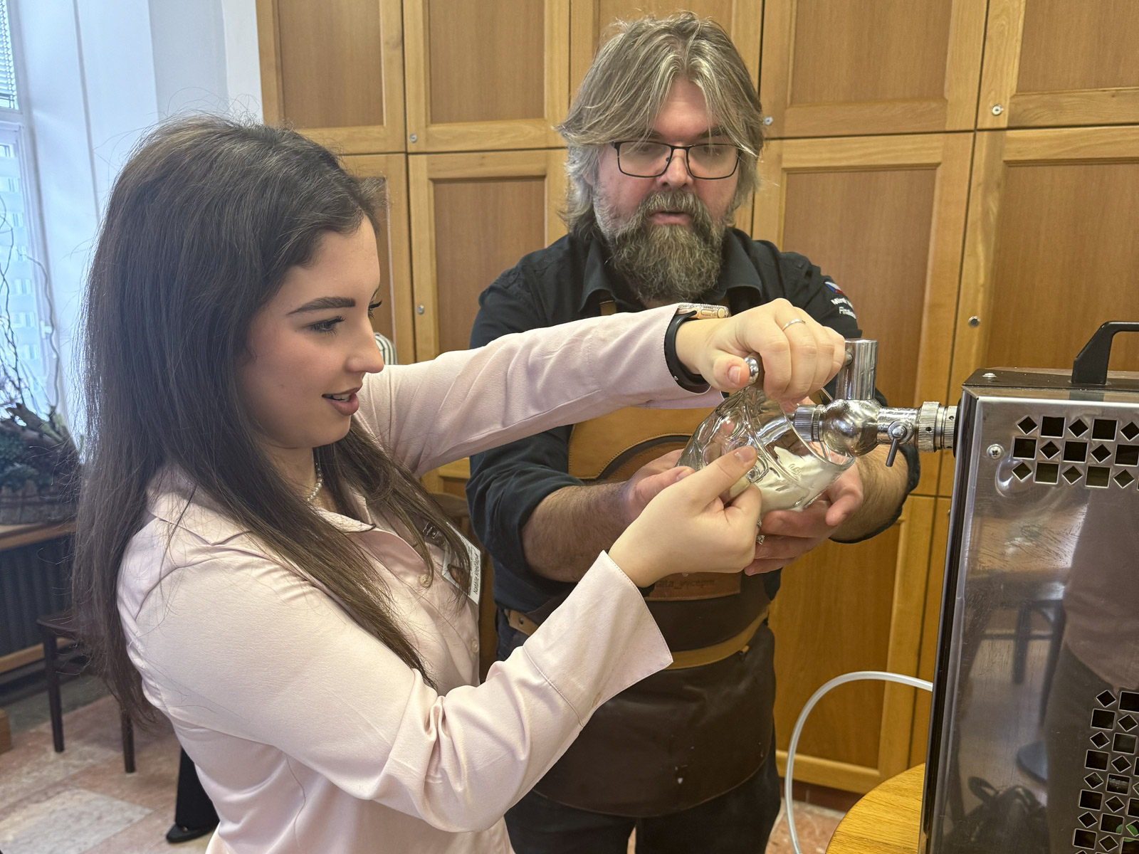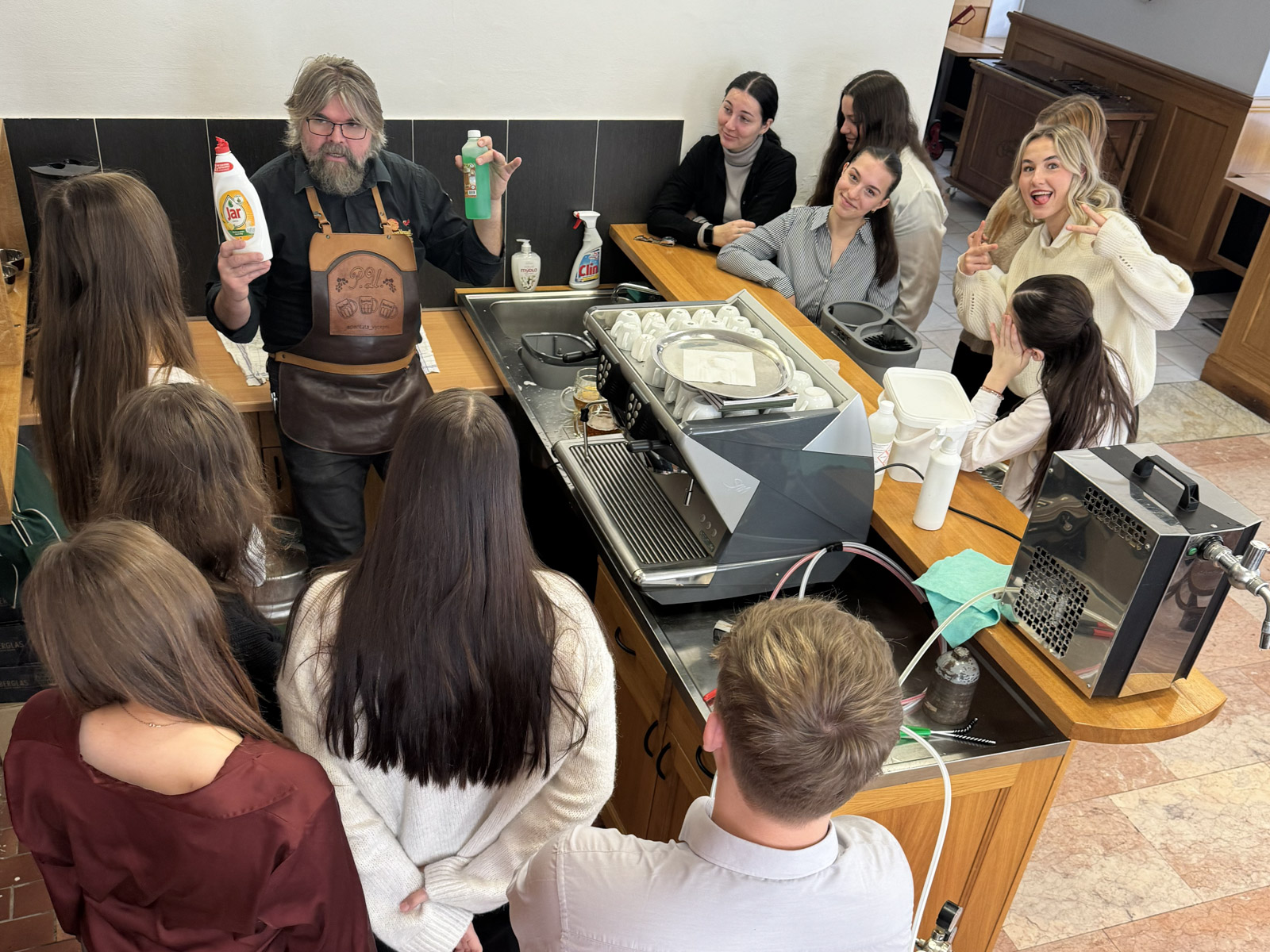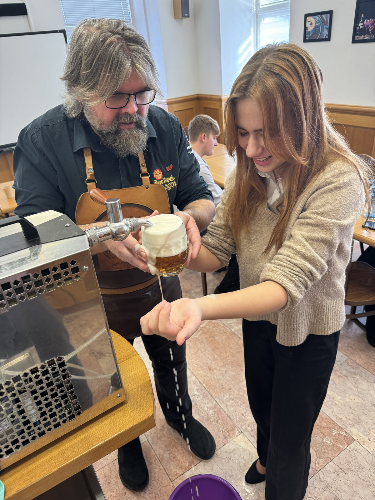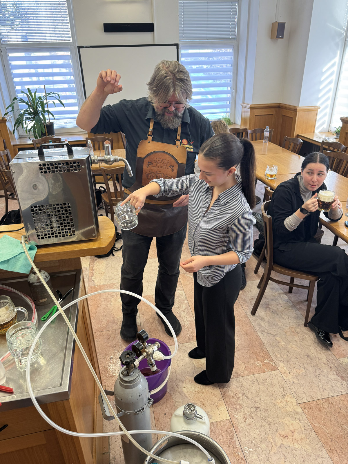 Po přednášce následoval praktický kurz čepování piva a ukázka sanitace výčepního zařízení. Bylo nám vysvětleno, jak důležité je o výčepní zařízení pečovat a jaký vliv má správně udržovaný výčep na finální kvalitu piva. Všichni jsme se prakticky naučili, jak se čepuje hladinka, šnyt nebo mlíko z nealkoholického piva Birell.