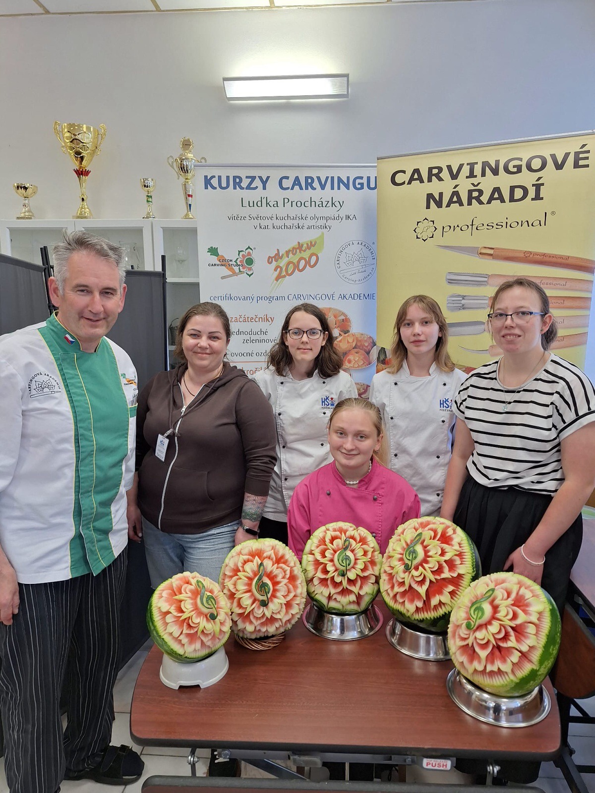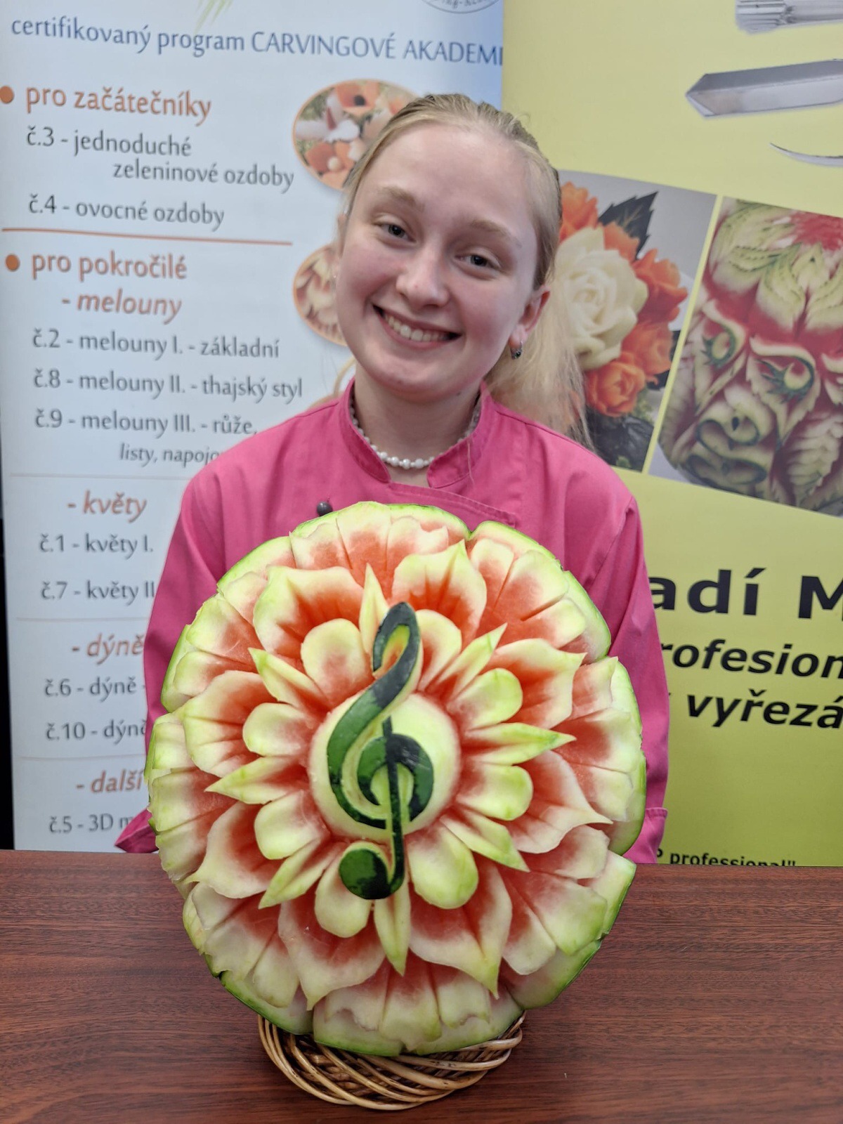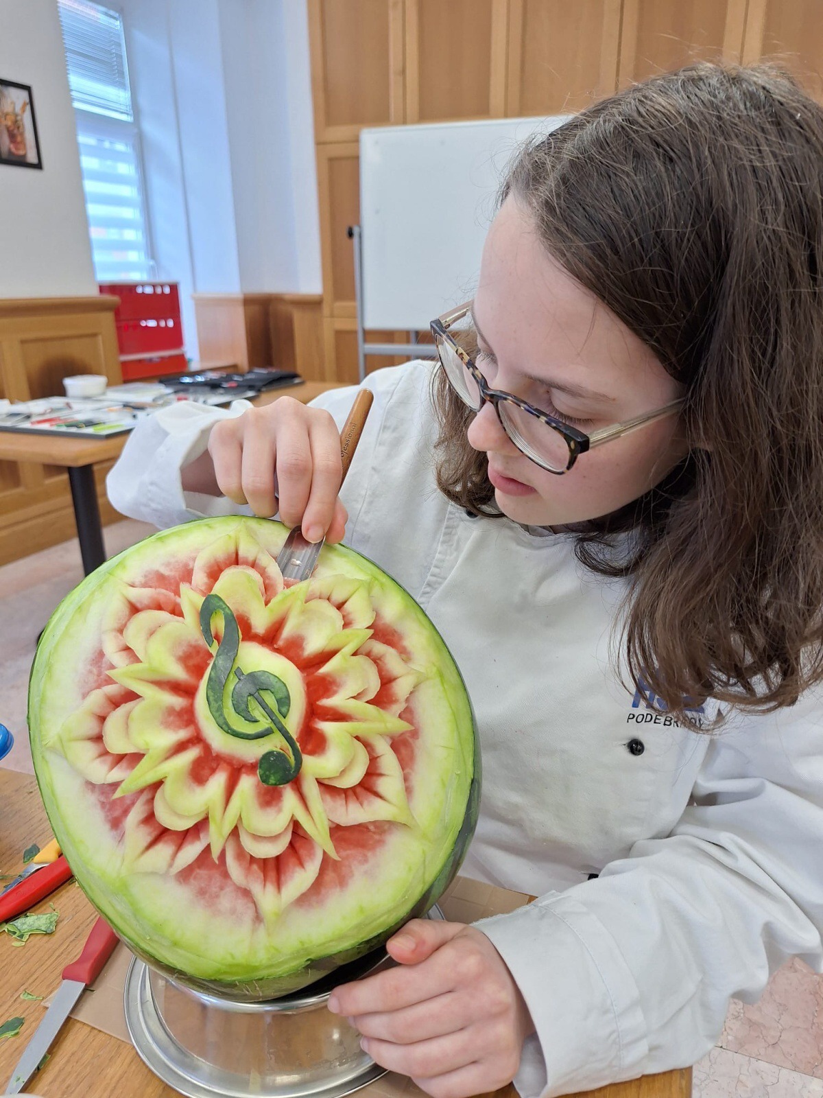 Ve dnech 29. a 30. května 2025 jsme se společně se dvěma spolužačkami zúčastnily pokračovacího kurzu carvingu, tedy uměleckého vyřezávání do ovoce a zeleniny. Kurz vedl pan Procházka, který nás už v minulosti provedl základy této techniky.
