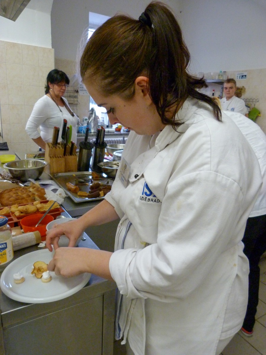Cukrářský kurz Restauračních dezertů proběhl na naší škole 1. - 2. 10. 2019 pod vedením Lucie Průšové. Ústředním tématem bylo využití základních cukrářských technik a lokálních zdrojů. Naučili jsme se, jak správně připravit odpalované a kynuté těsto, bezé korpus, savarin, créme anglaise, sabayon, compote, bavorský krém, cukrářský krém, italský sníh, ...Vše jsme se snažili skloubit s tradičními českými surovinami, jako jsou jablka, švestky, špendlíky a šípky. Kurz se nám velice líbil a těšíme se na další.