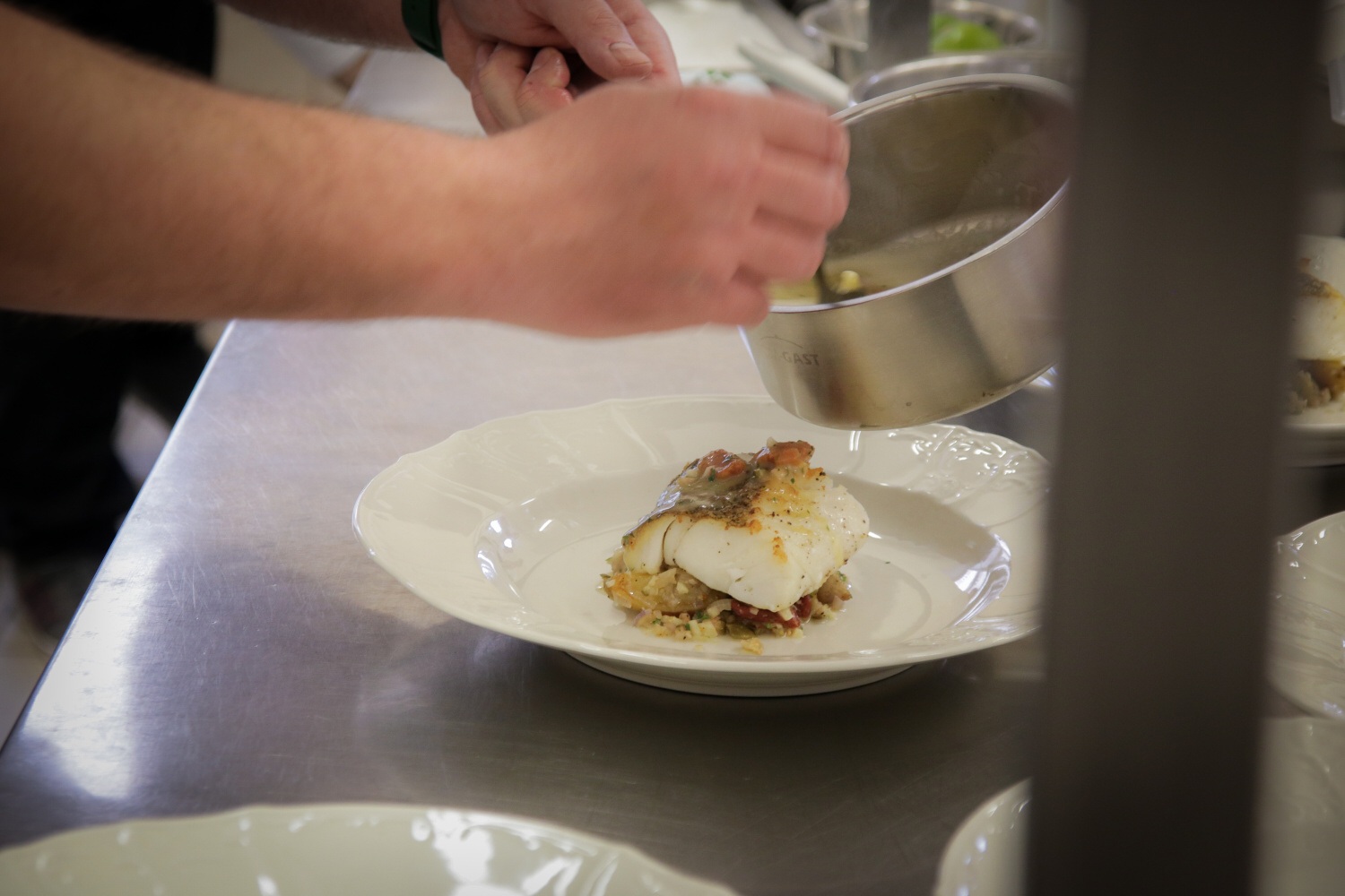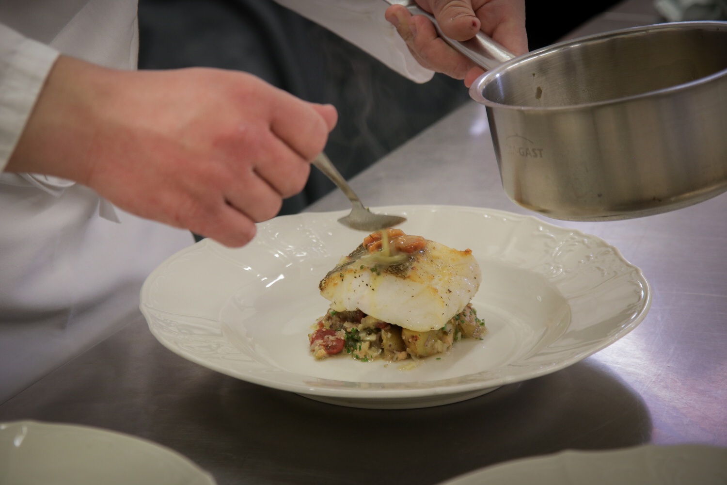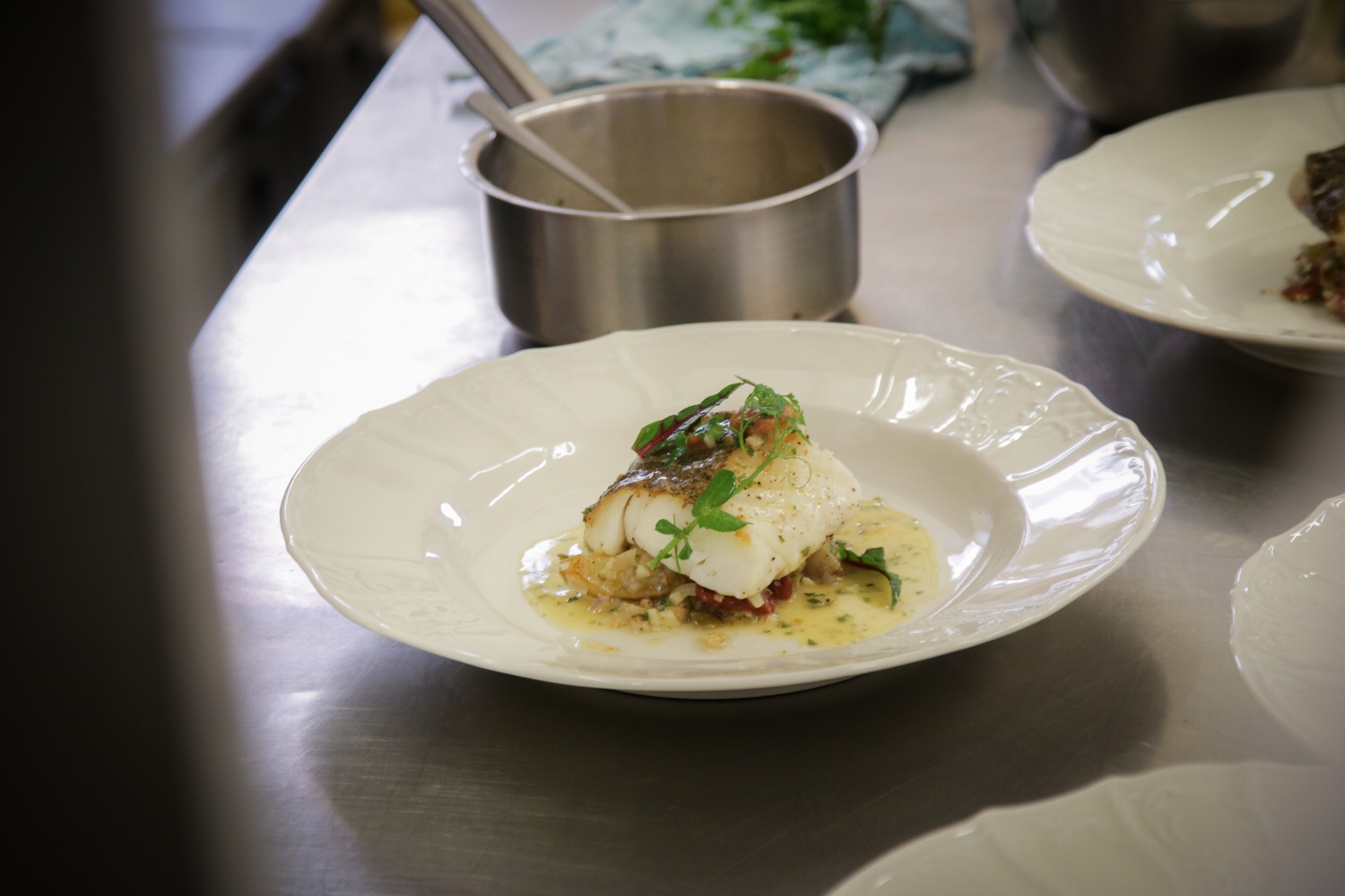 - Treska s bramborami Grenaille se šalotkou, sušenými rajčaty, kapary, česnekem a máslová omáčka s bílým vínem.