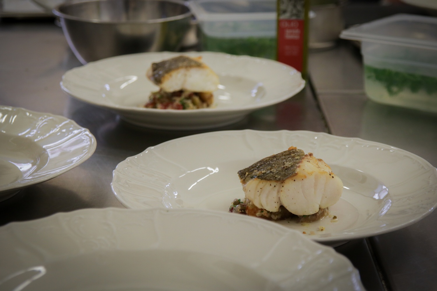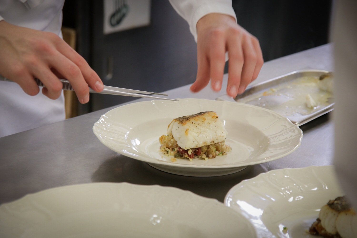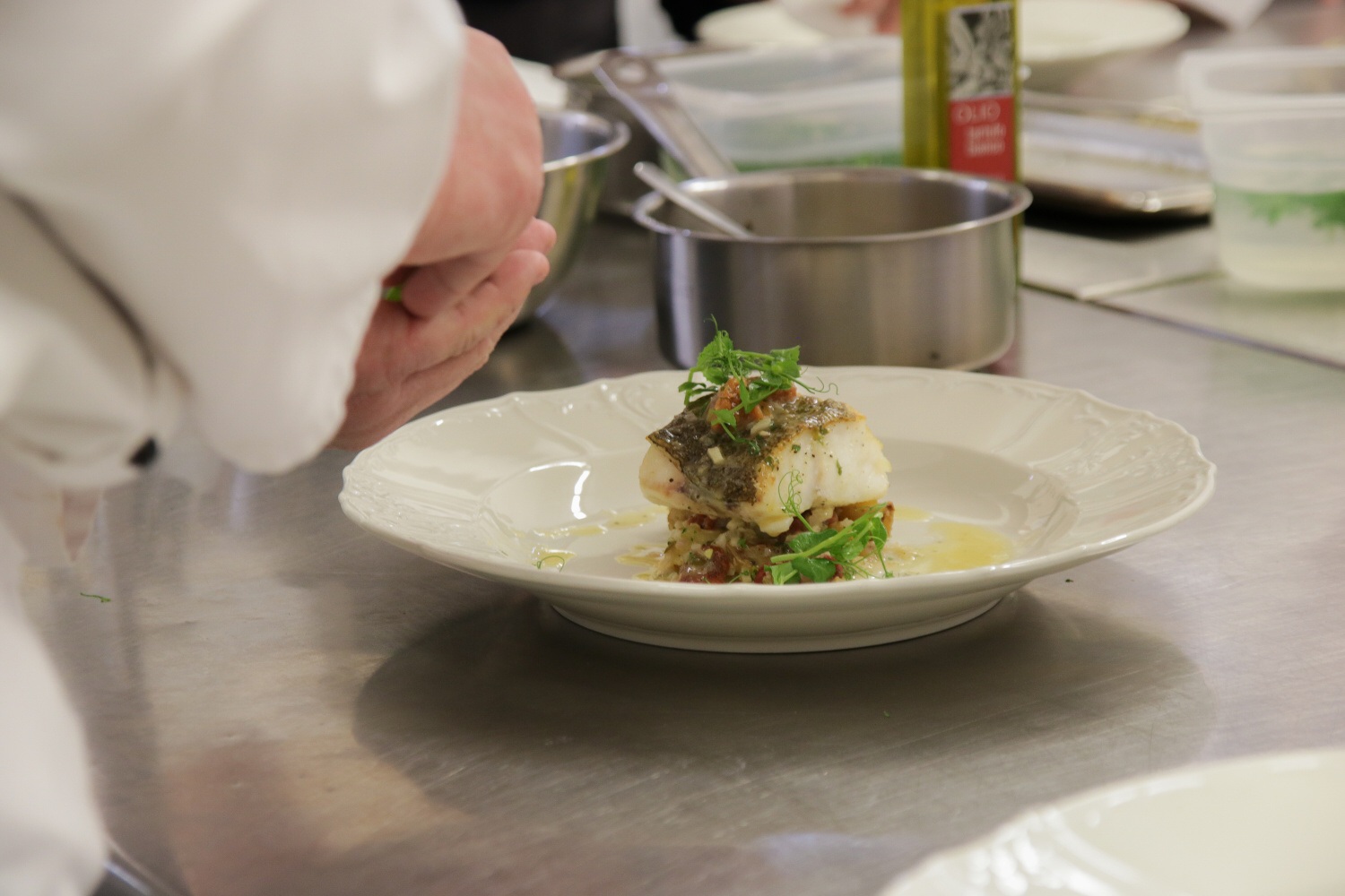 - Treska s bramborami Grenaille se šalotkou, sušenými rajčaty, kapary, česnekem a máslová omáčka s bílým vínem.