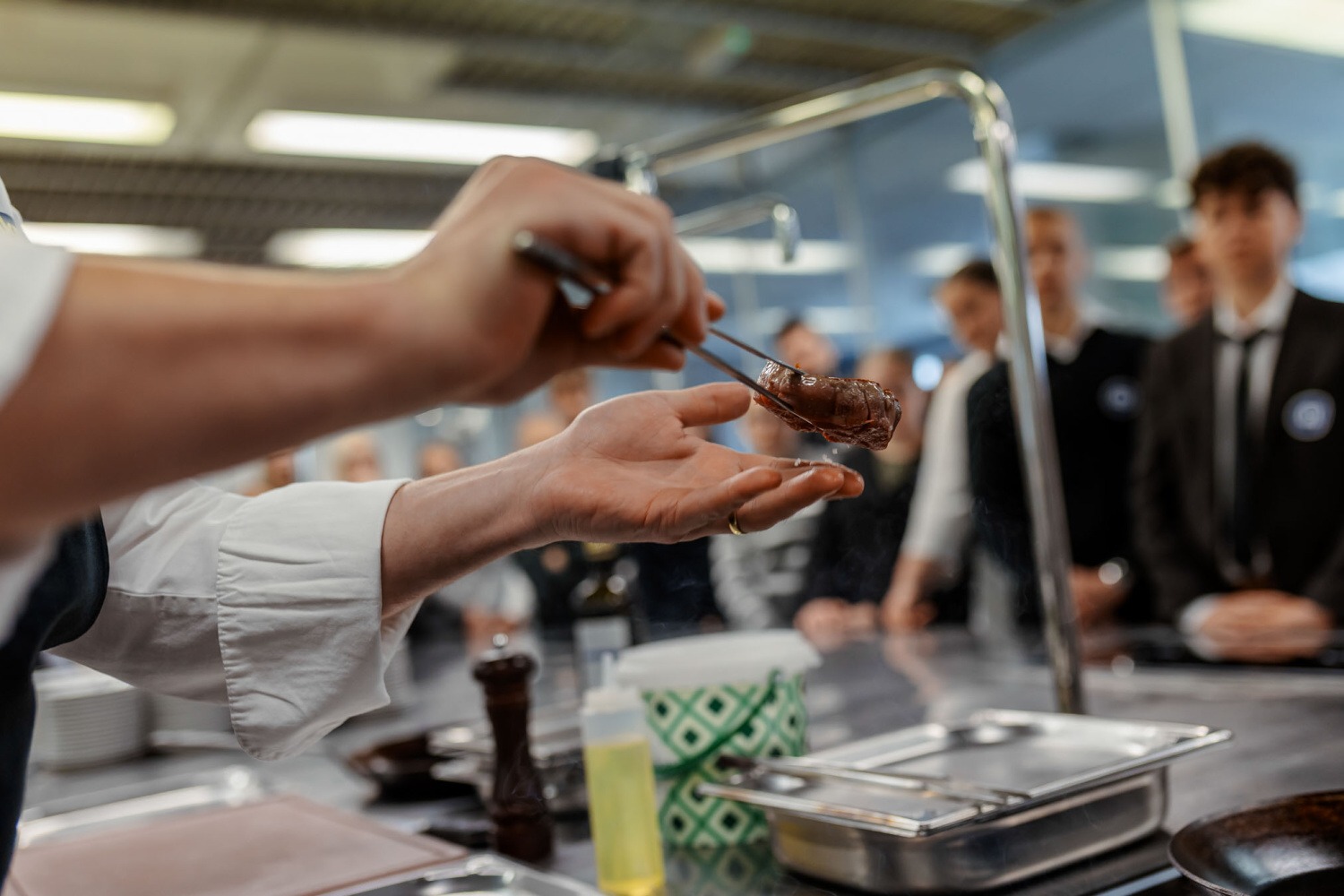 Navštívili jsme kuchyň, kde nám profesionální kuchaři ukázali, jak se naučit přípravu různých stupňů propečení steaků z hovězí svíčkové, a poté jsme je mohli ochutnat.