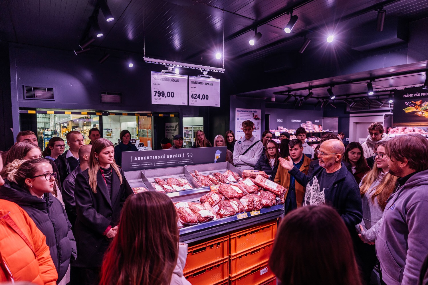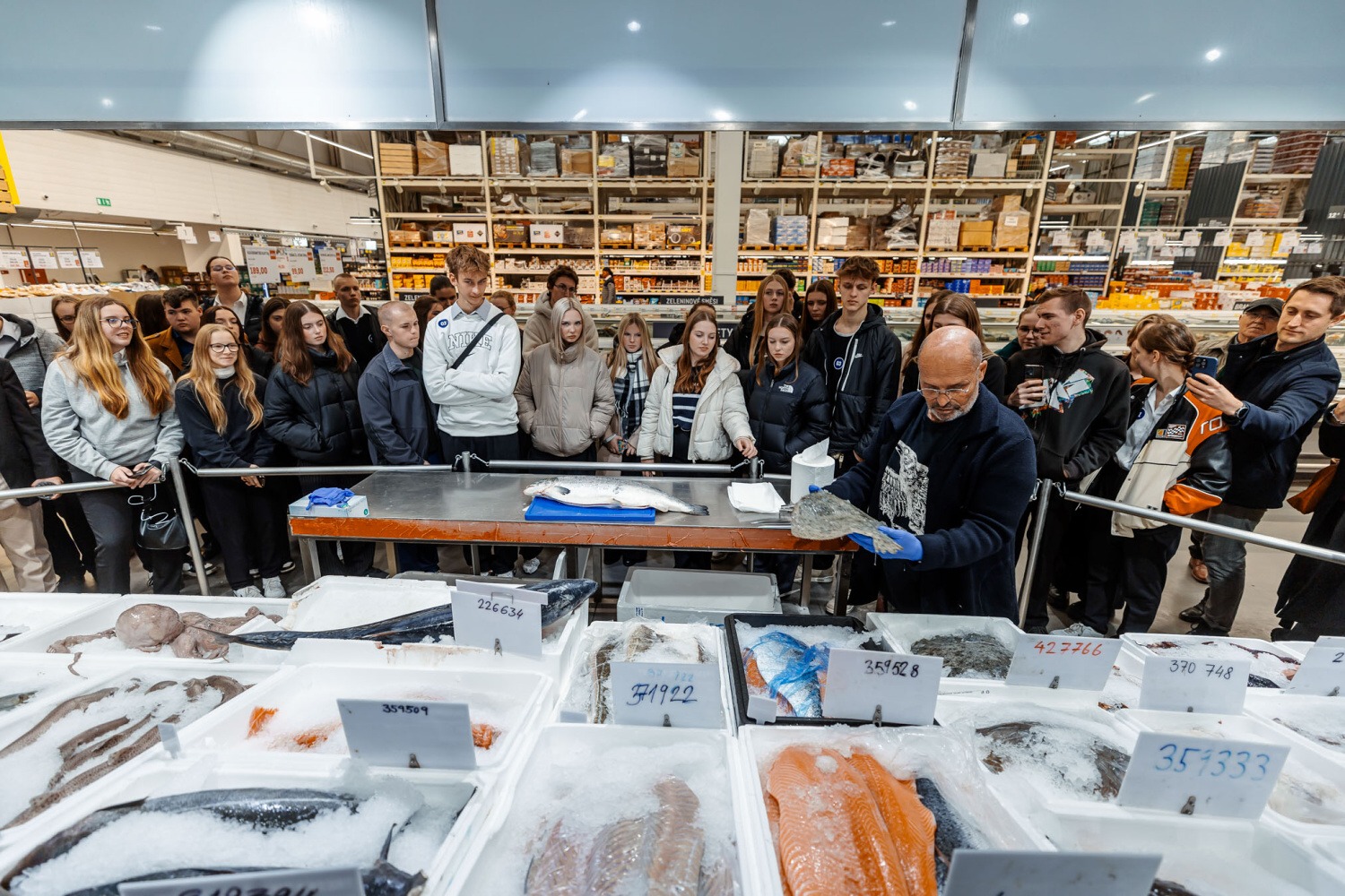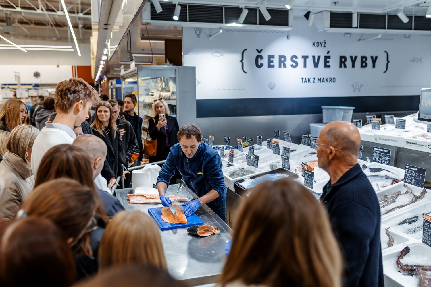 Následovala prohlídka prodejny Makro. Prošli jsme jednotlivé úseky: první s ovocem a zeleninou, kde jsme se dozvěděli zajímavosti o pěstování a dovozu různých druhů ovoce. Druhým úsekem byly ryby, kde na nás čekala ukázka porcování lososa, debata o mořských i říčních rybách a prohlédnutí chobotnice, krevet a dalších mořských plodů. Třetím úsekem byl mrazící box s masem, kde jsme mohli najít vše, na co si vzpomeneme, od líček až po kýtu. Když už nám všem byla opravdu zima, došli jsme k sekci s dochucovadly a podle složení na etiketách jsme porovnávali kvalitu produktů ostatních značek s produkty značky Makro. Posledním úsekem na prodejně bylo povídání o spotřebičích a restauračním inventáři vhodném pro gastronomické provozovny.