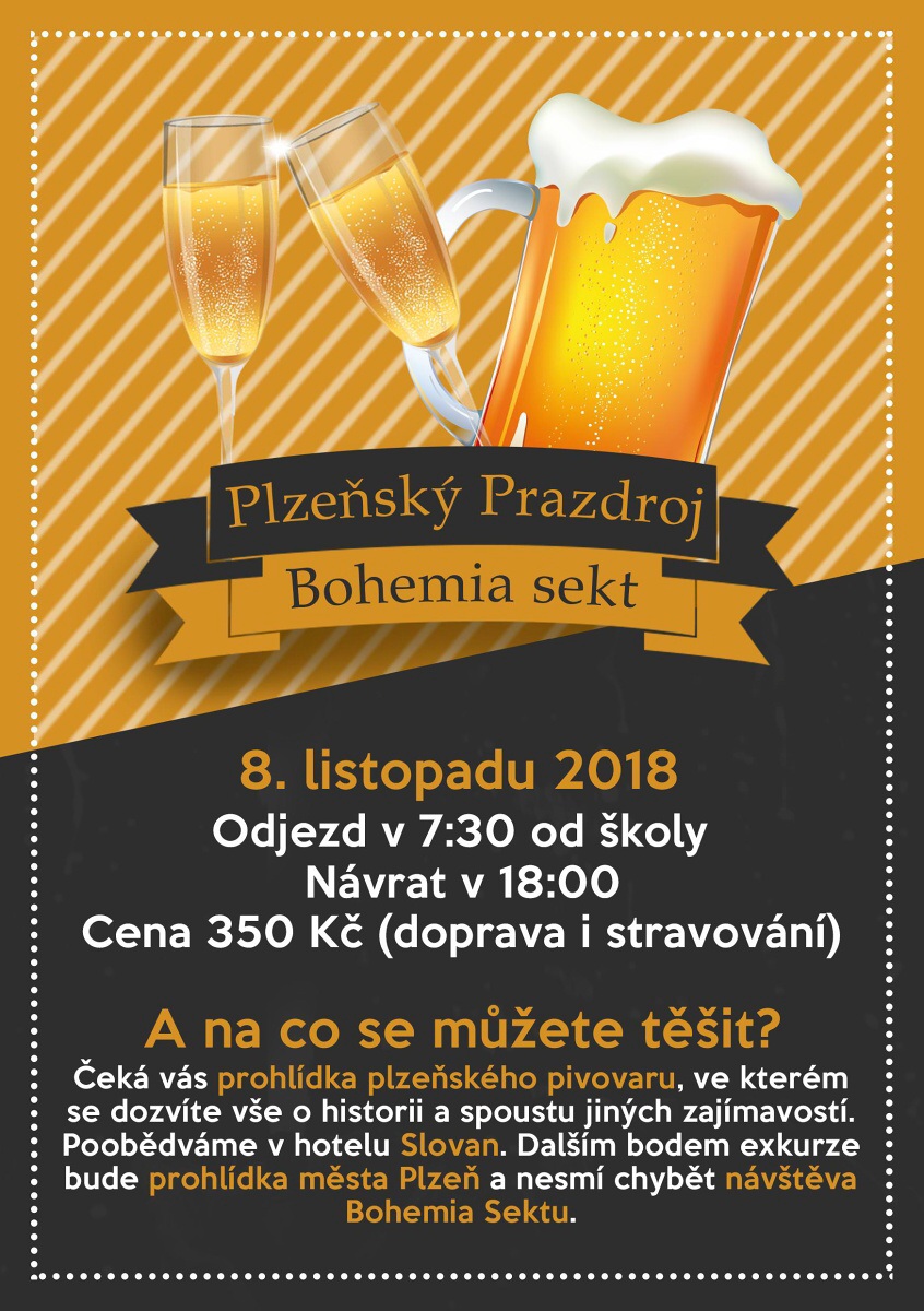 Ve čtvrtek 8. 11. 2018 se třídy druhých ročníků s průvodci z třetích ročníků zúčastnily exkurze do Plzně. Žáci navštívili pivovar Plzeňský Prazdroj, prohlédli si a poslechli výklady o památkách nacházejících se v Plzni a svou exkurzi zakončili v Bohemia Sektu ve Starém Plzenci.