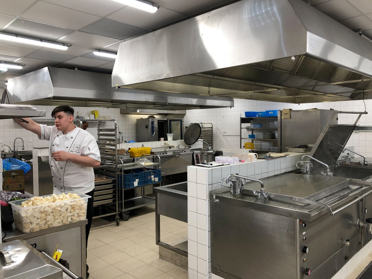 Poté jsme byli předáni kolegovi paní manažerky, který nám ukázal prostory sloužící pro catering. Viděli jsme například různé sály, kde se konají akce, včetně jednoho, ve kterém je údajně 2. nejlepší akustika na světě. Poté jsme sešli několik pater dolů a prohlédli jsme si teplou kuchyni, cukrárnu, suché sklady, sklad inventářů atd.