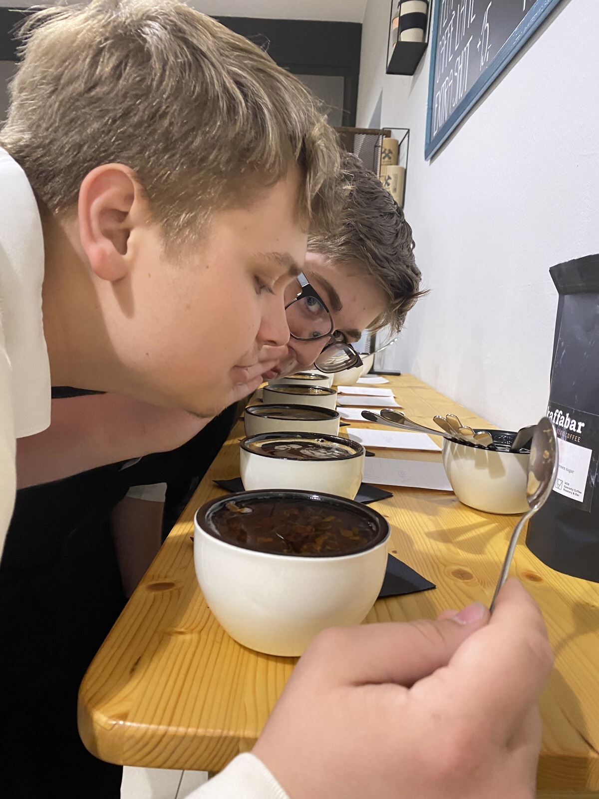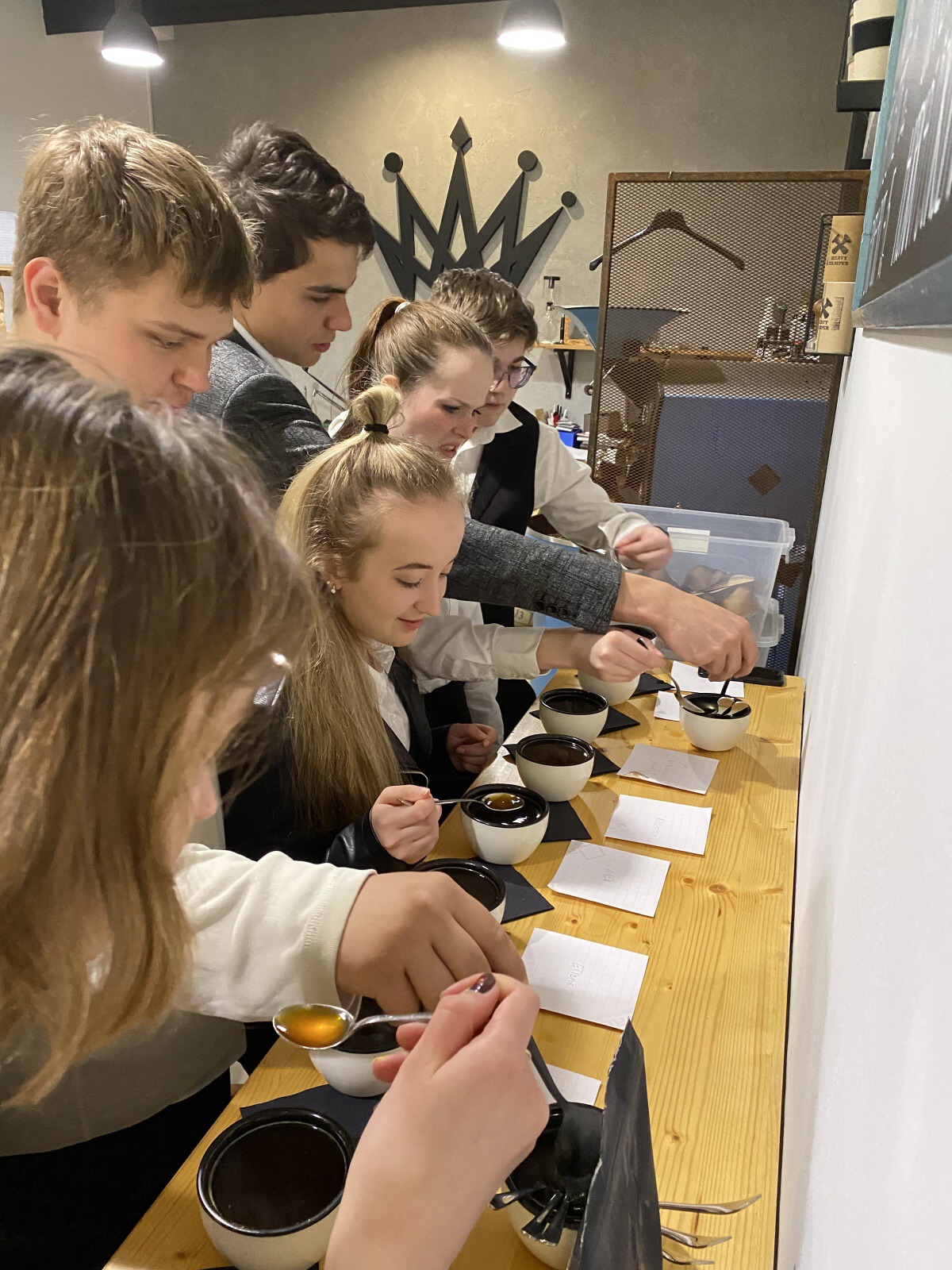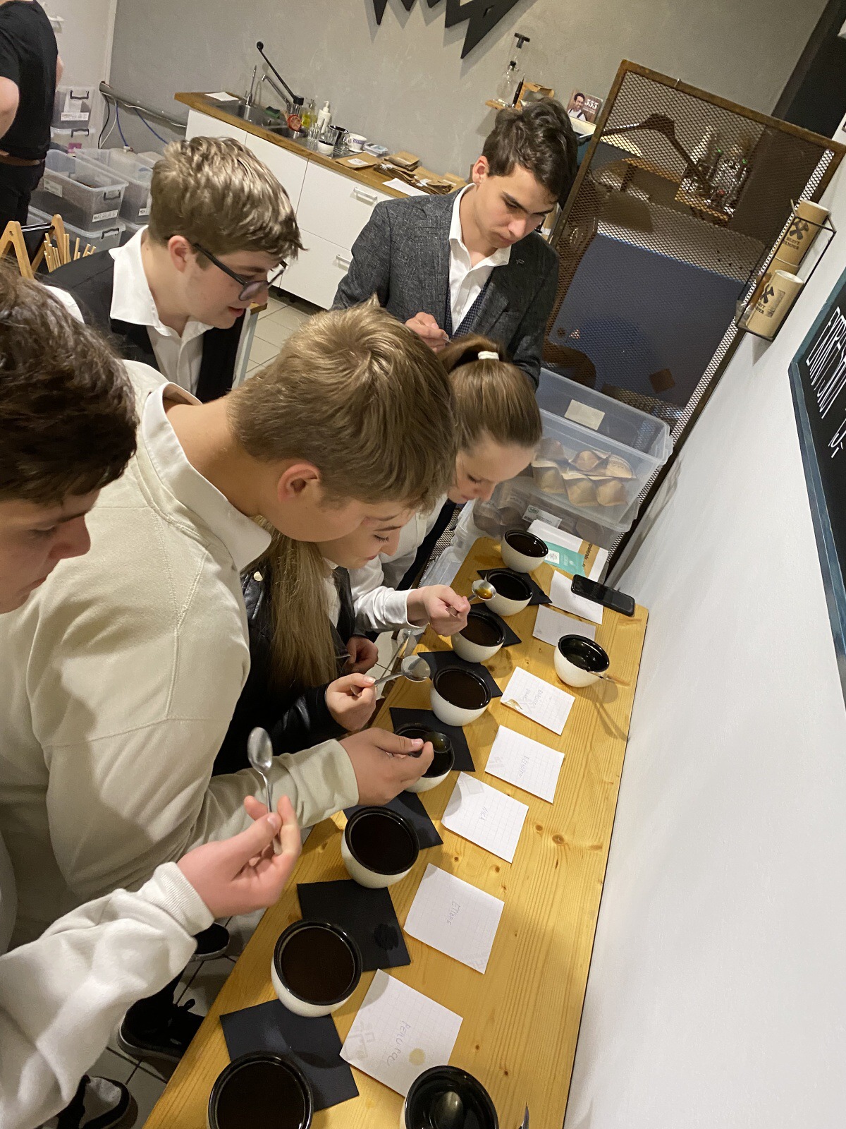 Po úvodní chvilce teorie – pěstování, sběru a základním dělení druhů kávy – nám ukázal, jakým způsobem se káva praží a jak zrna během pražení mění barvu. Dále jsme měli možnost vyzkoušet „Cupping“ čili degustaci kávy a zjistit, co nám nejlépe chutná. Porovnávali jsme tak vnímání chutí a vůní kávy, ochutnávali jsme různé druhy kávy (např. Brazílie, Cascara, Peru...).