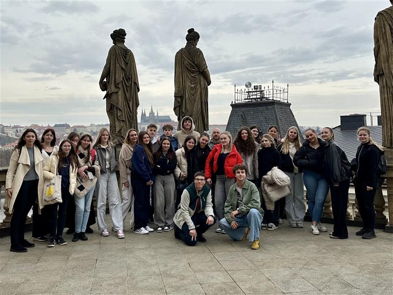 Celou exkurzi jsme zakončili v Národním divadle, kde nás (zatím) neprovázeli naši spolužáci, ale průvodci z divadla, se kterými jsme prošli téměř celé jeho prostory. Ve sklepě jsme si prohlédli základní kameny, pokračovali jsme do prostorů hlediště a po vyšlapání schodů, které byly tak dlouhé, že jsme v půlce začali snít o výtahu, jsme vyšli až na střechu, kde jsme měli krásný výhled na Prahu.