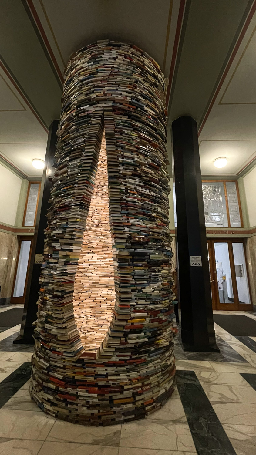Tím byl takzvaný Idiom v Městské knihovně Praha. Jedná se o sloup postavený z 8000 knih, zakončený z každé strany zrcadlem. Ne každý o Idiomu ví. Pro Čechy není až tak známý, ale turisté do Prahy kolikrát jezdí jen kvůli němu. Objevil se totiž v průvodci Lonely Planet, a tím se stal pro cizince častou zastávkou při prohlídkách Prahy.