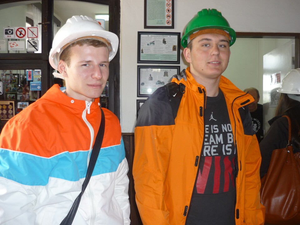 V Hornickém skanzenu jsme si z bezpečnostních důvodů nasadili přilby a někteří z nás dostali i baterky, abychom si mohli ve štolách svítit na cestu. Na každém kroku jsme se přesvědčovali, že práce horníků ve stísněných prostorách byla skutečně nadlidská a velmi často i životu nebezpečná.