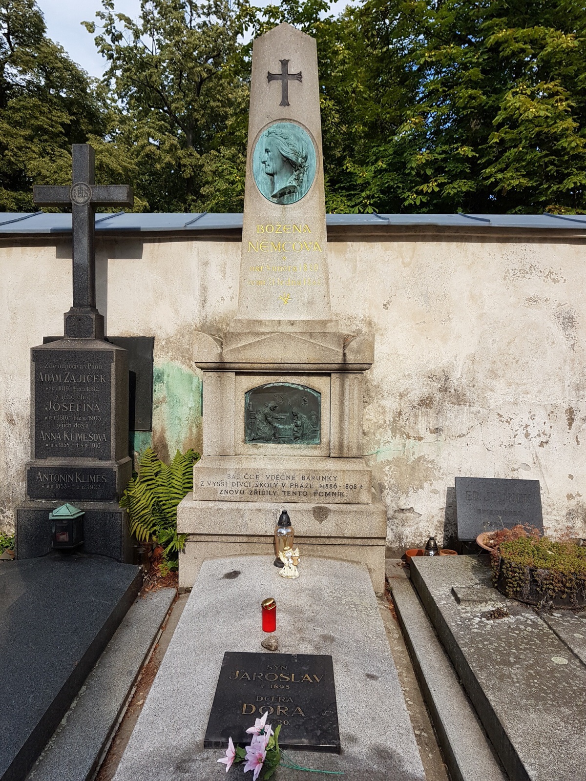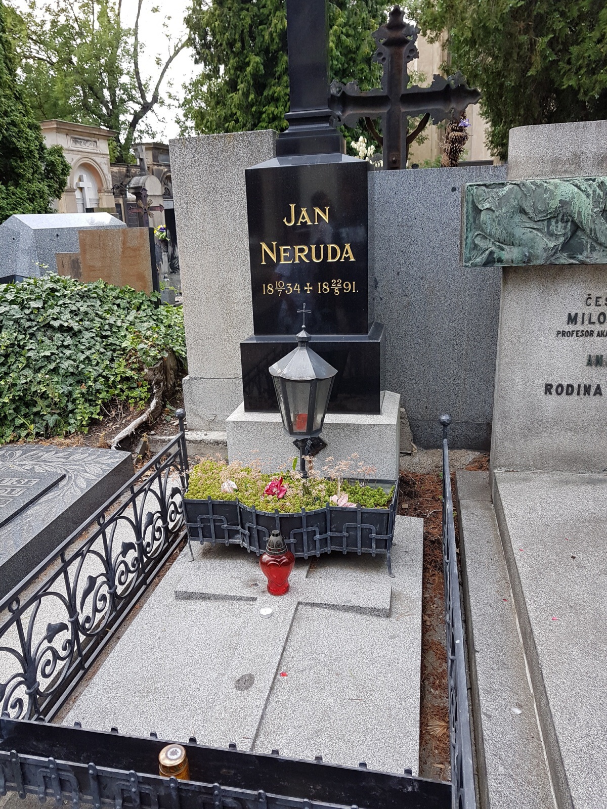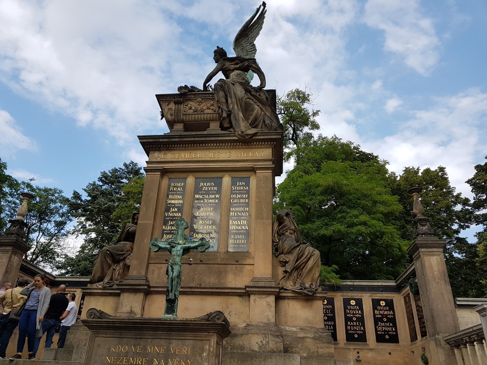 Naše hlavní destinace byl však vyšehradský hřbitov se Slavínem vedle basiliky svatého Petra a Pavla. Kdo chtěl, mohl se podívat i dovnitř kostela, většina z nás alespoň nakoukla do dveří. Hřbitov je od 19. století národním pohřebištěm a jsou zde pochované významné české osobnosti a jejich rodiny. Na východní straně hřbitova se nachází zmíněný Slavín, který nás nejvíce zajímal. Jsou zde pohřbeny jedny z nejvýznamnějších českých osobností, jako je Julius Zeyer, Jaroslav Vrchlický, Alfons Mucha a mnoho dalších.