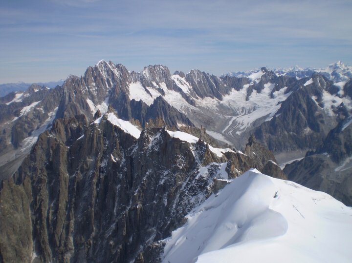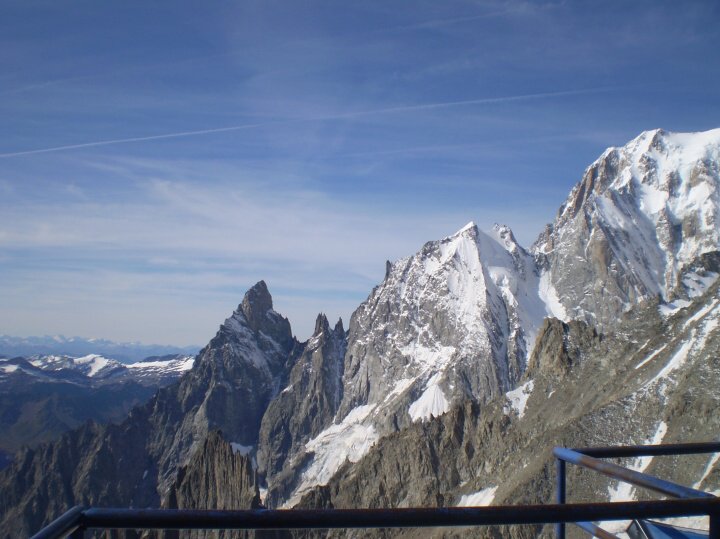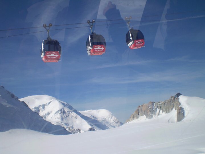 Odtud jsme měli možnost pokračovat panoramatickou lanovkou dále až téměř k hranicím s Itálií na Pointe Helbronner (3462 m. n. m.). Rozhodli jsme se ihned nastoupit a stálo to za to. Ze čtyřmístné kabinky se nám naskytl nezapomenutelný pohled na nejvyšší horu Evropy a na věčnou masu ledu a sněhu ani v dálce nekončících Alp.