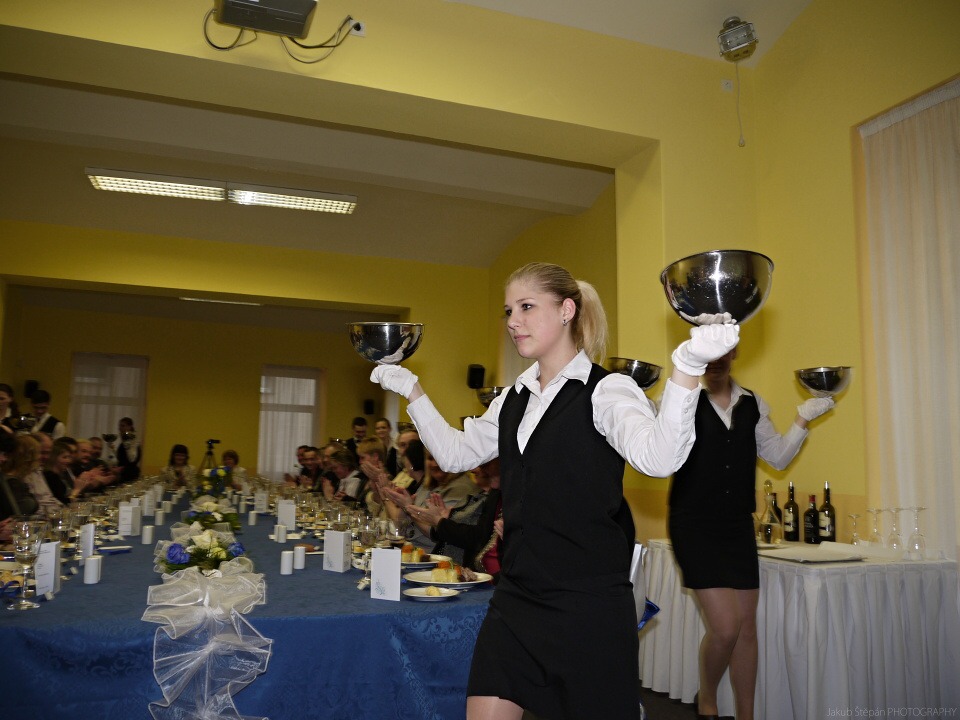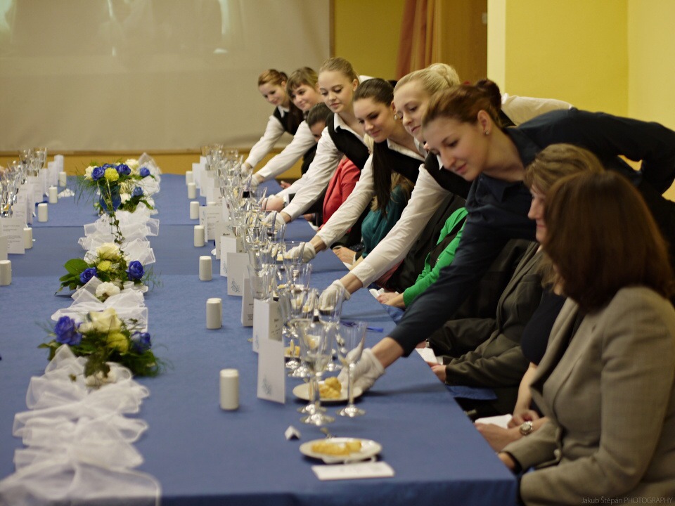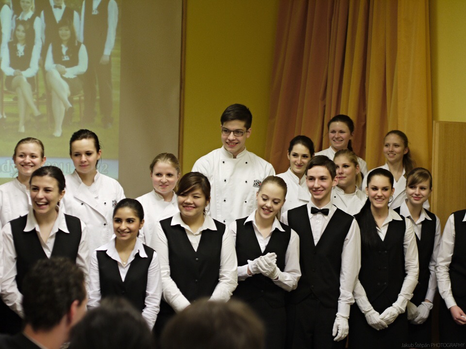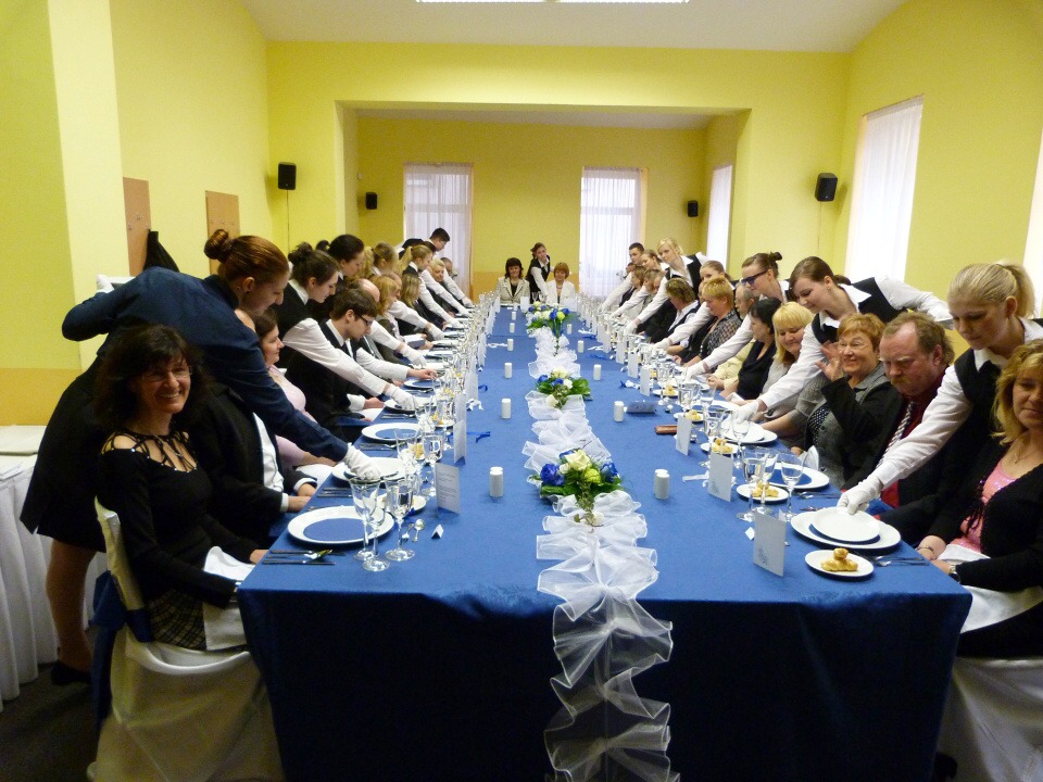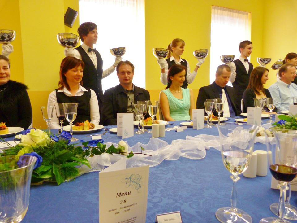 Ve dnech 12. a 13. dubna 2013 se na Hotelové škole v Poděbradech uskutečnil slavnostní banket naší třídy 2.B. Od slavnostní tabule po více chodové menu jsme vše vymýšleli a připravovali sami. Poslední čtvrtek před banketem jsme se sešli ve dvě hodiny a dali se do finálních příprav. Jednalo se o rozdělení surovin, pulírování inventáře, prostření tabule či předpřípravu některých pokrmů. Já, jakožto hlavní vedoucí, jsem měla za úkol vymyslet proslov. Všichni jsme ulehali velice nervozní, ačkoliv jak se později ukázalo, bylo to naprosto zbytečné. V pátek 12. 4. jsme se sešli v sedm hodin a dali se do práce. Skupina výroby začala vařit a obsluha doprostírala stoly. Vše jsme vyčistili a přivedli k dokonalosti. Ve zbytku času jsme začali nacvičovat odbornou obsluhu. Myslím, že debaras a servis pokrmu na čtyři doby byl asi nejtěžší a u pokusu zvedat gloše a cinkat s nimi o sebe jsme se nejvíc nasmáli. Nakonec zbyla i chvilka pro osobní přípravu- načesat si vlasy a obléknout se. Ve dvě hodiny dorazili rodiče. Po vypití svého welcome drinku jsem je vyzvala, aby se usadili ke slavnostní tabuli. A vše začalo. Debaras talíře, servis předkrmu, debaras, servis, vše stále dokola. I přes skluz, který nastal při servisu hlavního chodu, vše dopadlo skvěle jak v pátek, tak i v sobotu. Rodiče odcházeli v oba dny dojati a s příjemně plným bříškem. V sobotu odpoledne ovšem nastal nejkrušnější moment ve chvíli, kdy nám došlo, že již vše skončilo a že to musíme uklidit. Kupodivu, i přes můj strach, všichni pracovali, abychom mohli co nejdříve odjet domů. Myslím, že jsme si z toho všichni něco odnesli, protože při závěrečném poděkování škole a našim skvělým odborným učitelům a poslechu hry na klávesy našeho spolužáka, jsem si všimla, že v tento moment jsme téměř poprvé jako jedna třída, kolektiv, přátelé. Ještě jednou velké díky našim odborným učitelům Pavlíně Roubíčkové, Miroslavě Seifertové a Františku Pospíšilovi.