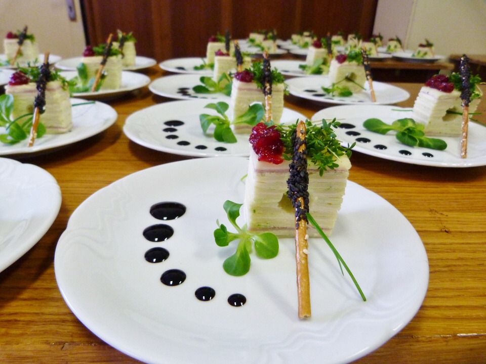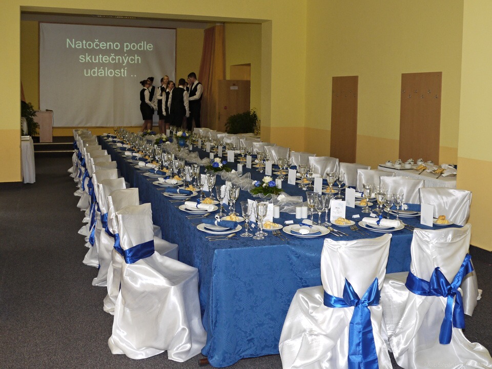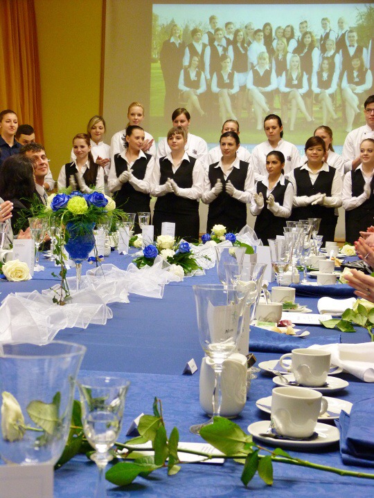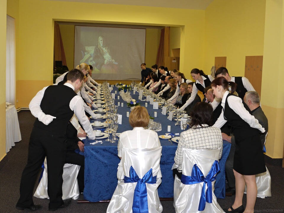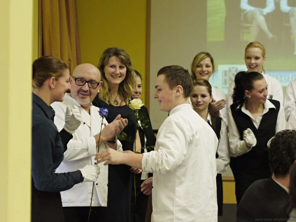 Ve dnech 12. a 13. dubna 2013 se na Hotelové škole v Poděbradech uskutečnil slavnostní banket naší třídy 2.B. Od slavnostní tabule po více chodové menu jsme vše vymýšleli a připravovali sami. Poslední čtvrtek před banketem jsme se sešli ve dvě hodiny a dali se do finálních příprav. Jednalo se o rozdělení surovin, pulírování inventáře, prostření tabule či předpřípravu některých pokrmů. Já, jakožto hlavní vedoucí, jsem měla za úkol vymyslet proslov. Všichni jsme ulehali velice nervozní, ačkoliv jak se později ukázalo, bylo to naprosto zbytečné. V pátek 12. 4. jsme se sešli v sedm hodin a dali se do práce. Skupina výroby začala vařit a obsluha doprostírala stoly. Vše jsme vyčistili a přivedli k dokonalosti. Ve zbytku času jsme začali nacvičovat odbornou obsluhu. Myslím, že debaras a servis pokrmu na čtyři doby byl asi nejtěžší a u pokusu zvedat gloše a cinkat s nimi o sebe jsme se nejvíc nasmáli. Nakonec zbyla i chvilka pro osobní přípravu- načesat si vlasy a obléknout se. Ve dvě hodiny dorazili rodiče. Po vypití svého welcome drinku jsem je vyzvala, aby se usadili ke slavnostní tabuli. A vše začalo. Debaras talíře, servis předkrmu, debaras, servis, vše stále dokola. I přes skluz, který nastal při servisu hlavního chodu, vše dopadlo skvěle jak v pátek, tak i v sobotu. Rodiče odcházeli v oba dny dojati a s příjemně plným bříškem. V sobotu odpoledne ovšem nastal nejkrušnější moment ve chvíli, kdy nám došlo, že již vše skončilo a že to musíme uklidit. Kupodivu, i přes můj strach, všichni pracovali, abychom mohli co nejdříve odjet domů. Myslím, že jsme si z toho všichni něco odnesli, protože při závěrečném poděkování škole a našim skvělým odborným učitelům a poslechu hry na klávesy našeho spolužáka, jsem si všimla, že v tento moment jsme téměř poprvé jako jedna třída, kolektiv, přátelé. Ještě jednou velké díky našim odborným učitelům Pavlíně Roubíčkové, Miroslavě Seifertové a Františku Pospíšilovi.