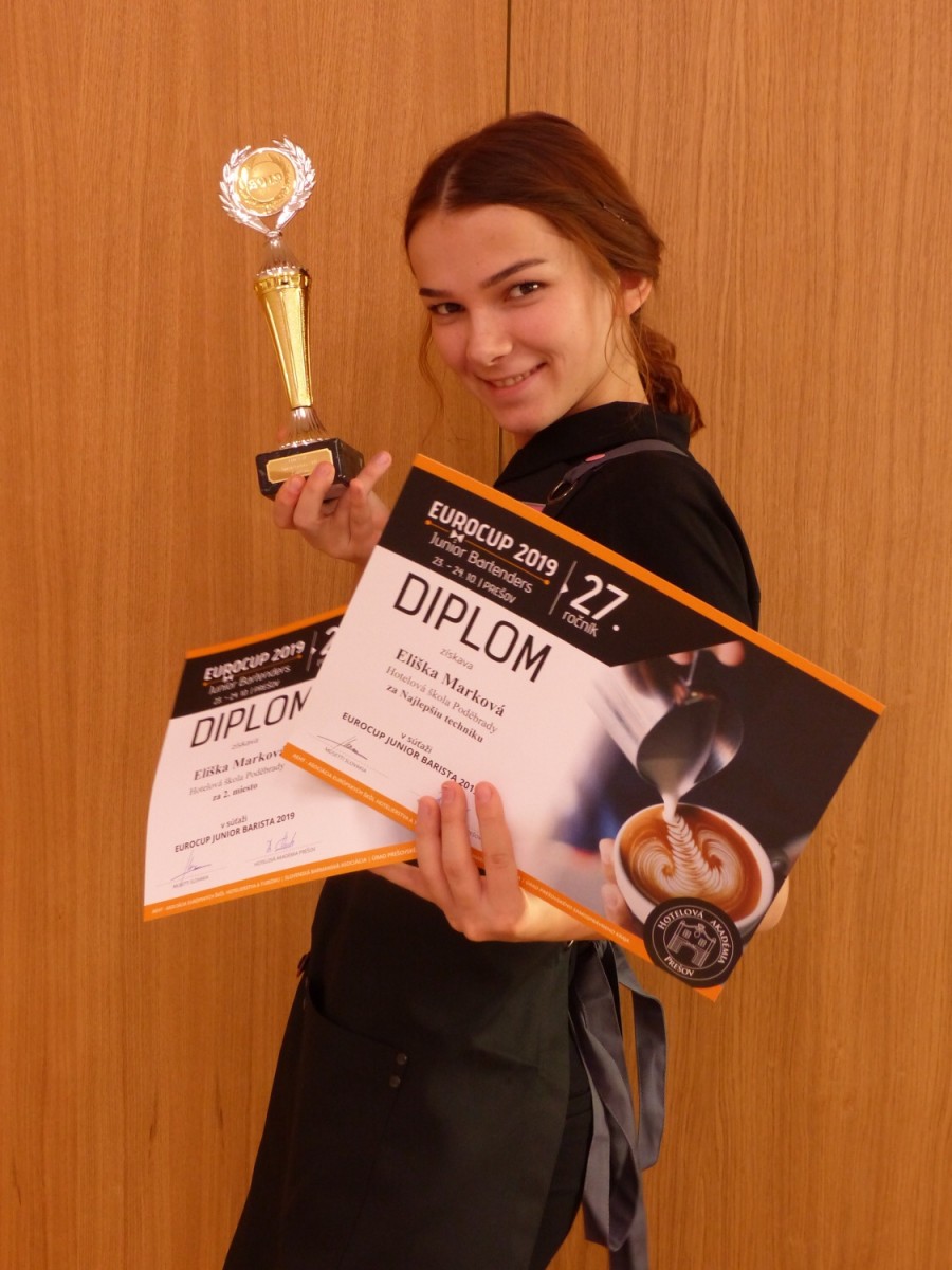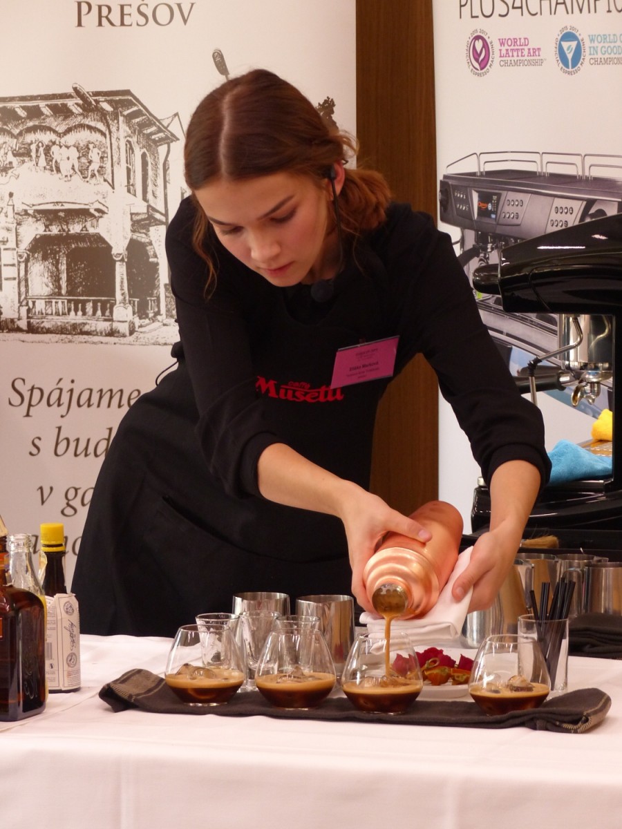 Letos v říjnu jsme se já, Eliška Marková a paní učitelka Marie Marešová vydaly na mezinárodní baristickou soutěž do Prešova. Na Slovensko jsme se dostaly vlakem a strávily jsme dvě noci v hotelu Lineas. Soutěž byla zahájena 23. října v 8 hodin. Celkem bylo 12 soutěžících. Vylosovala jsem si 6. pořadí, takže jsem měla možnost se podívat na výkony ostatních. Zúčastnili se nejen Slováci, ale i Slovinci a za Českou republiku jsem zde byla jediná. V průběhu dne se také konal cupping (ochutnávka káv) od místní kavárny Nico Caffé.
