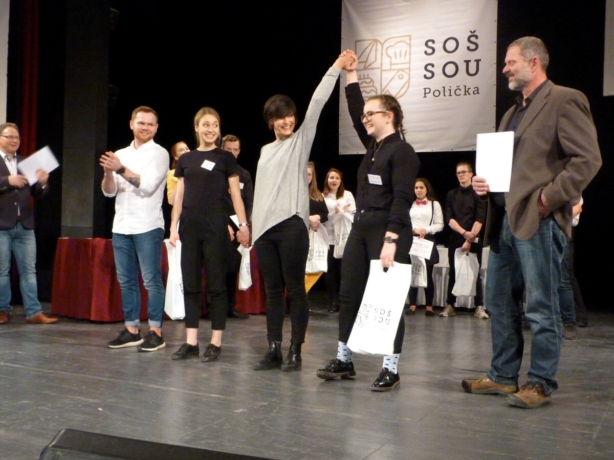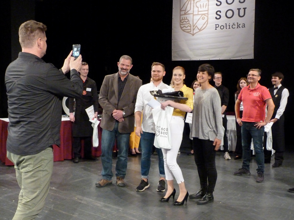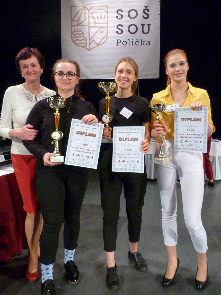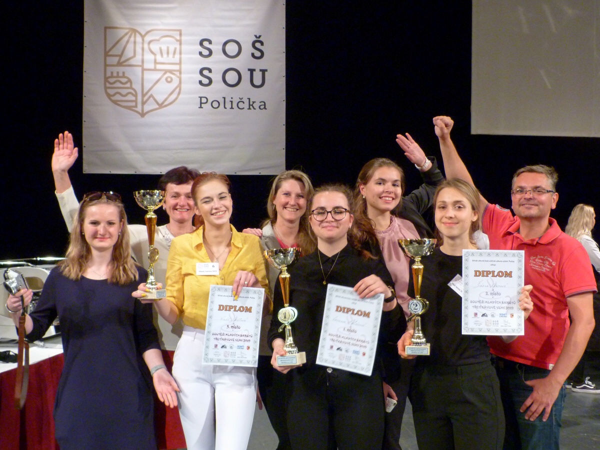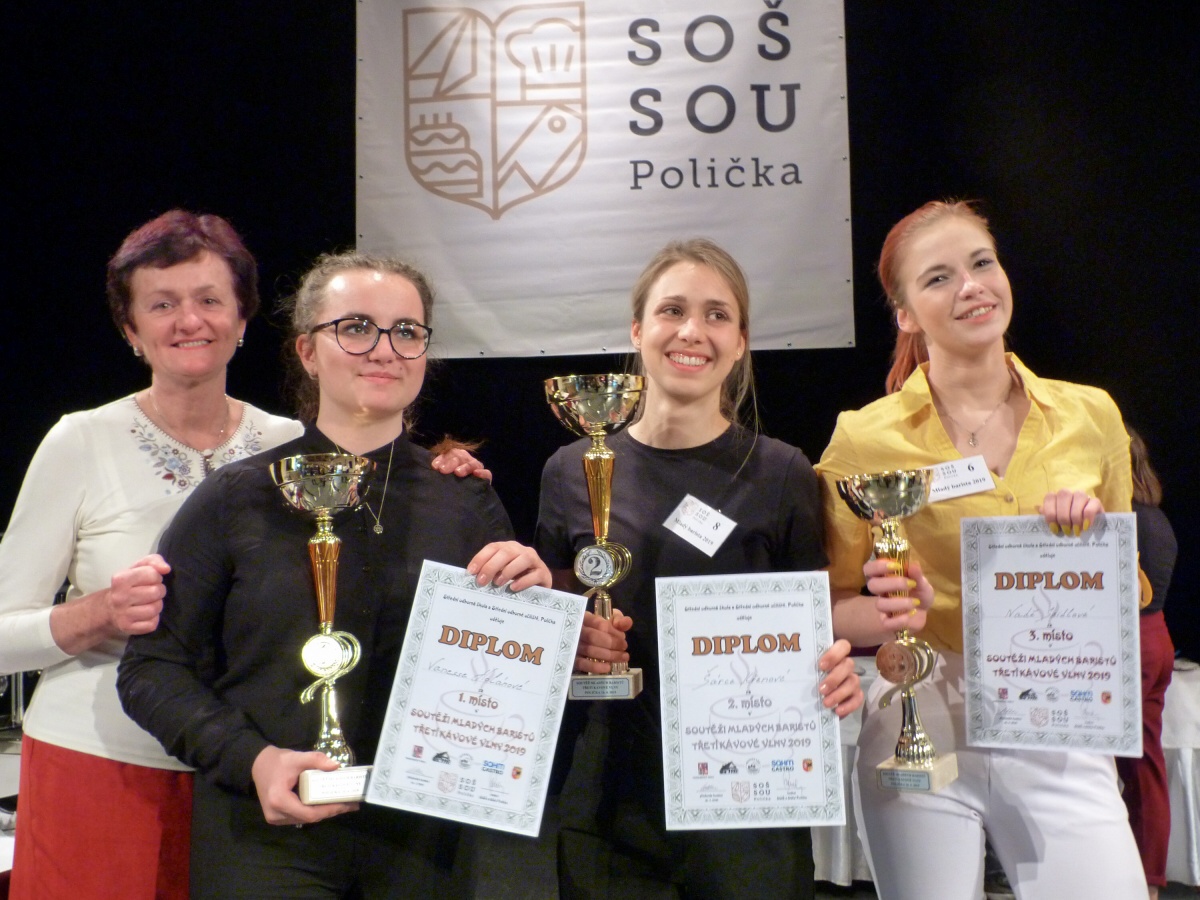 Tým baristů naší školy pod vedením paní učitelky Koštýřové a za doprovodu paní Roubíčkové se z baristické soutěže v Poličce vrátil opět se všemi třemi místy. Naši školu reprezentovaly Šárka Křenová, Vanessa Holánová a Naďa Seidlová. Jako psychická podpora a pomoc jely juniorky Kačka Havelková a Kristýna Krejčová.