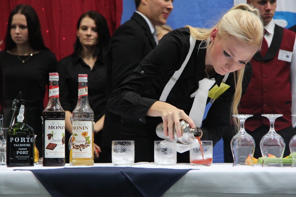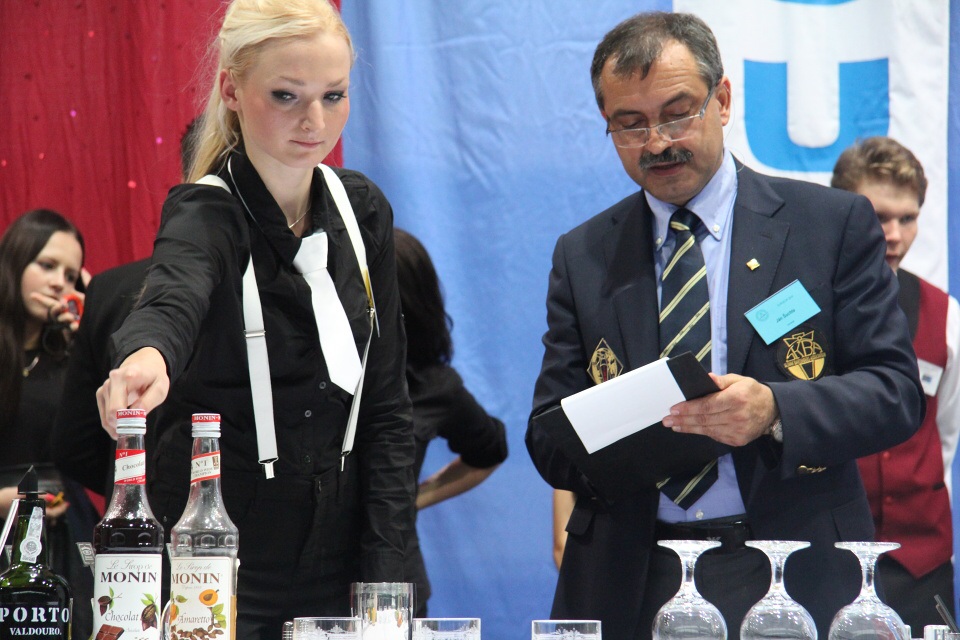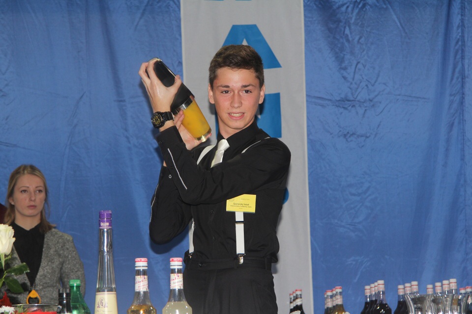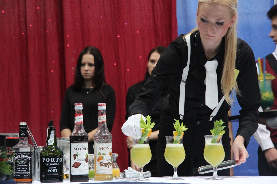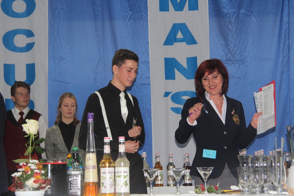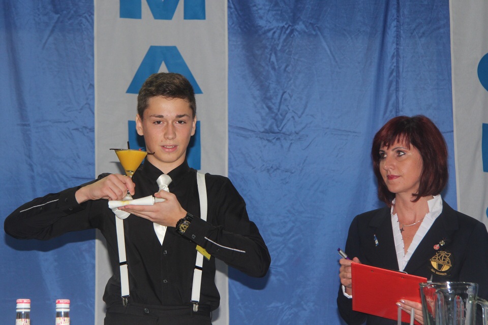 Po vydatné snídani jsme se s „malými nervíky“ přesunuli do tělocvičny, kde už bylo vše připravené. Za úkol jsme měli namíchat dva koktejly. Jeden nealkoholický soft drink a druhý na bázi Jacka Danielse after dinner cocktail. Vašek měl pořadové číslo 21. Soutěžil se svým nealkoholickým nápojem Teemo okurkovo-malinovým koktejlem s dotykem šalvěje a druhým alkoholickým nápojem s názvem Tennesy Taxi s příchutí manga. Já jsem vystupovala až v druhé polovině soutěže s číslem 54 se svým nealkoholickým Bambínem, kde je výrazná chuť řapíkatého celeru, s nímž jsem skončila na hezkém 22. místě. Druhý alkoholický nápoj Gentleman Jack chutnal po portském vínu a čokoládě.