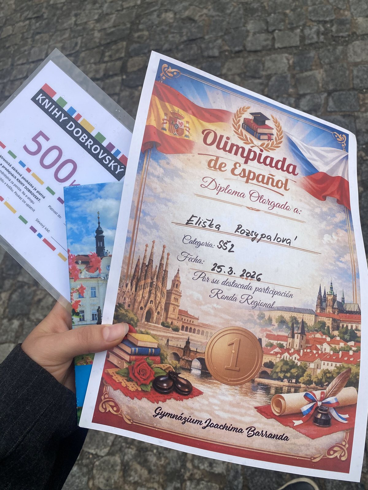 V krajském kole olympiády ve francouzštině v Nymburce obsadila úžasné 3. místo ve Středočeském kraji! Mimořádným Eliščiným úspěchem je „zlatá medaile" z Berouna v kategorii SŠ2 v krajské soutěži ve španělském jazyce.