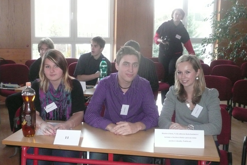 Dne 30. 11.2010 jsme se společně s Tomášem Žítkem (3.C) a Simonou Sluťákovou (4.B) zúčastnili soutěže Svět patří nám, kterou pořádala Obchodní akademie, Hotelová škola a Střední odborná škola v Turnově. Jednotlivá družstva soutěžila v disciplínách zaměřených na cestovní ruch. Soutěže se zúčastnilo šest týmů z Čech a stejný počet týmů z Moravy. V dopoledních hodinách představili soutěžící své regiony v anglickém a německém jazyce. V našem týmu soutěžila v německém jazyce Simona Sluťáková, která se umístila na krásném 2. místě této kategorie. V českém jazyce proběhla individuální disciplína „Výklad z vyhlídkového místa“. Odborná porota hodnotila nejen kvalitu mluveného projevu, ale současně i dovednost práce s interaktivní tabulí. Soutěžící ovládali interaktivní tabuli pomocí webové služby Virtualtravel. Následovala skupinová disciplína zaměřená na odborné vědomosti a projektové dovednosti. Tady jsme rozhodovali o směrech rozvoje cestovního ruchu perspektivních oblastí a počítali splátky úvěrů rekonstrukce objektů určených k podnikání v cestovním ruchu. Nejlepší jednotlivci obdrželi diplom. Odpoledne rozhodl o celkovém pořadí družstev finálový test. Pomocí moderního hlasovacího zařízení jsme označovali správné odpovědi z oblasti techniky a geografie cestovního ruchu, dějin kultury a umění, moderních trendů i virtuální podpory služeb cestovního ruchu. Následovala delší přestávka a vyhlášení výsledků. Náš tým se umístil na 5. místě se 139 body.
