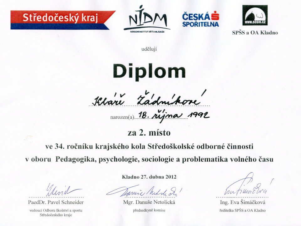 V rámci oboru Pedagogika, psychologie a sociologie získala 2. místo a postup do celostátního kola soutěže