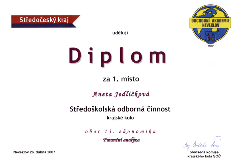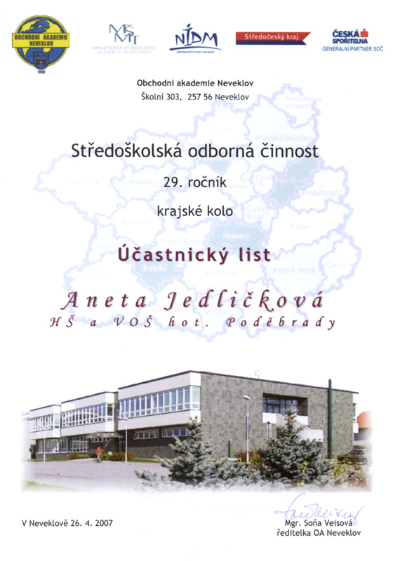 Stejně jako v minulých letech se naše škola zúčastnila i v letošním roce krajského kola Středoškolské odborné soutěže. Nominovány byly dvě soutěžní práce z oboru Ekonomika a podnikání – Finanční analýza studentky Anety Jedličkové a Kongresová turistika studentky Pavly Gardelkové. Krajské kolo soutěže se uskutečnilo 26. 4. 2007 v příjemném prostředí OA v Neveklově. V průběhu soutěže studenti obhajovali před komisí své práce. Při závěrečném vyhlašování jsme byli velmi spokojeni. V této kategorii obsadila: