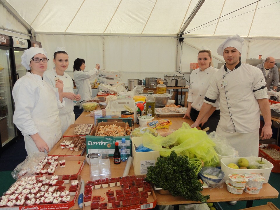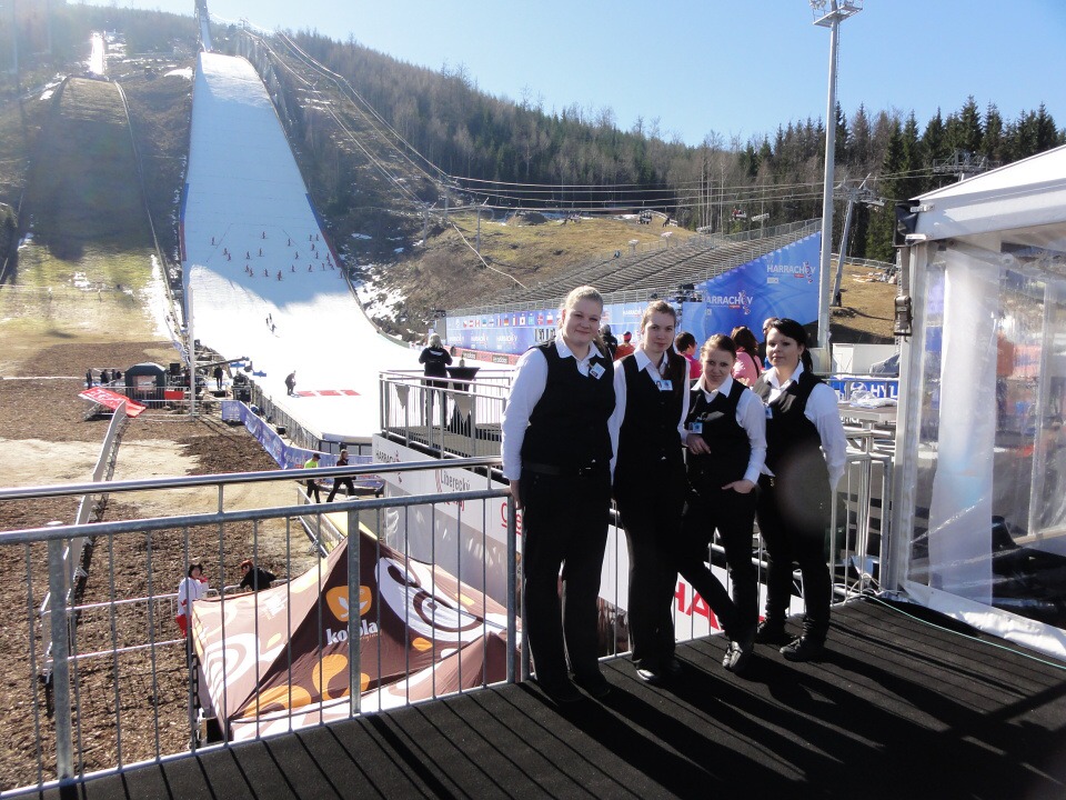 Od 12. – 16. 3. 2014 se 27 studentů všech ročníků vyšší odborné školy vydalo na Mistrovství světa v letech na lyžích do Harrachova zajišťovat catering. Popravdě nikdo z nás netušil, jak náročné to bude a kolik hodin denně budeme muset stát s úsměvem na nohou a obsluhovat VIP hosty. Ale přesto jsme do toho šli. Cateringová společnost nám zajistila krásné ubytování v dřevěných apartmánech s bohatou snídaní a odvozem na stanoviště luxusními automobily. Každý den začínal přípravami jednotlivých pracovišť, po kterých následoval meeting, kde byl zhodnocen předchozí den. Někteří z nás obsluhovali VIP salónky, jiní připravovali občerstvení v kuchyni a další prodávali venku ve stáncích občerstvení a nápoje. Pan Lahoda, majitel cateringové společnosti, byl s námi velice spokojen a nešetřil slovy chvály. Celkově na akci vládla přátelská atmosféra, nejen mezi námi obsluhujícími a šéfy, ale hlavně mezi hosty a námi. To se nám hned pracovalo mnohem lépe, když jsme viděli, že naši snahu dokázal někdo ocenit.