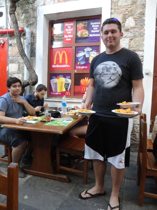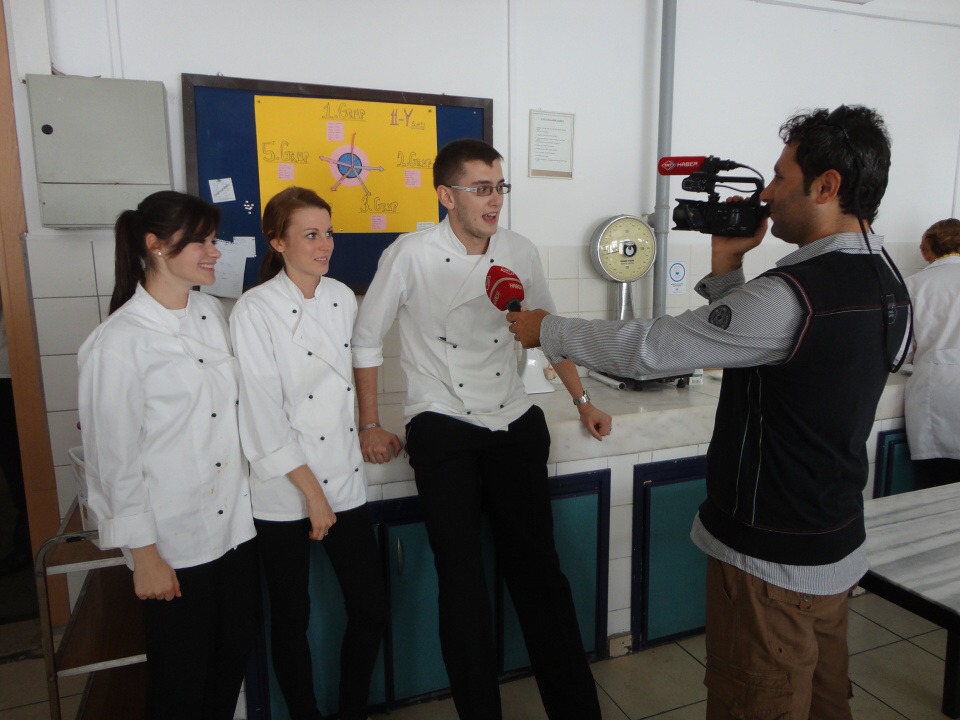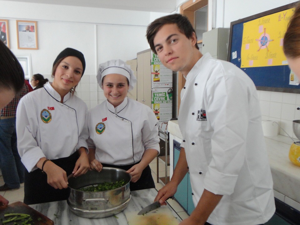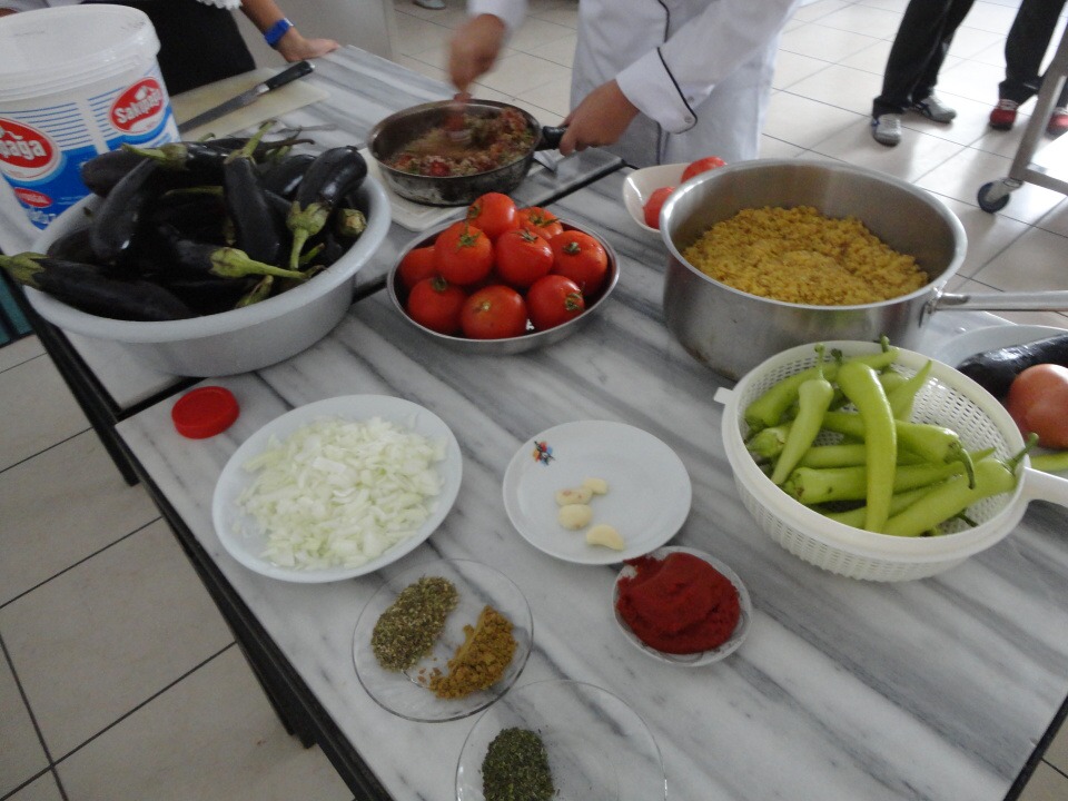 Středa otestovala organizační schopnosti našich hostitelů, projektového vaření se totiž účastnily všechny čtyři skupiny, celkem asi 30 studentů. Červeno-zelené menu nabízelo čočkové kuličky, kopoglu, polévku trarhana, borek, kebab i pilaf. Zpestřením dne bylo jak natáčení pro tureckou televizi [http://tvarsivi.com/player.php?i=2013100392853], tak i výuka tureckého národního tance. I v těchto „tanečních“ jsme nakonec uspěli, za reprezentaci patří díky Aleně a Petrovi.