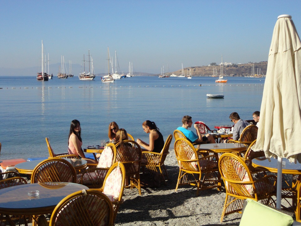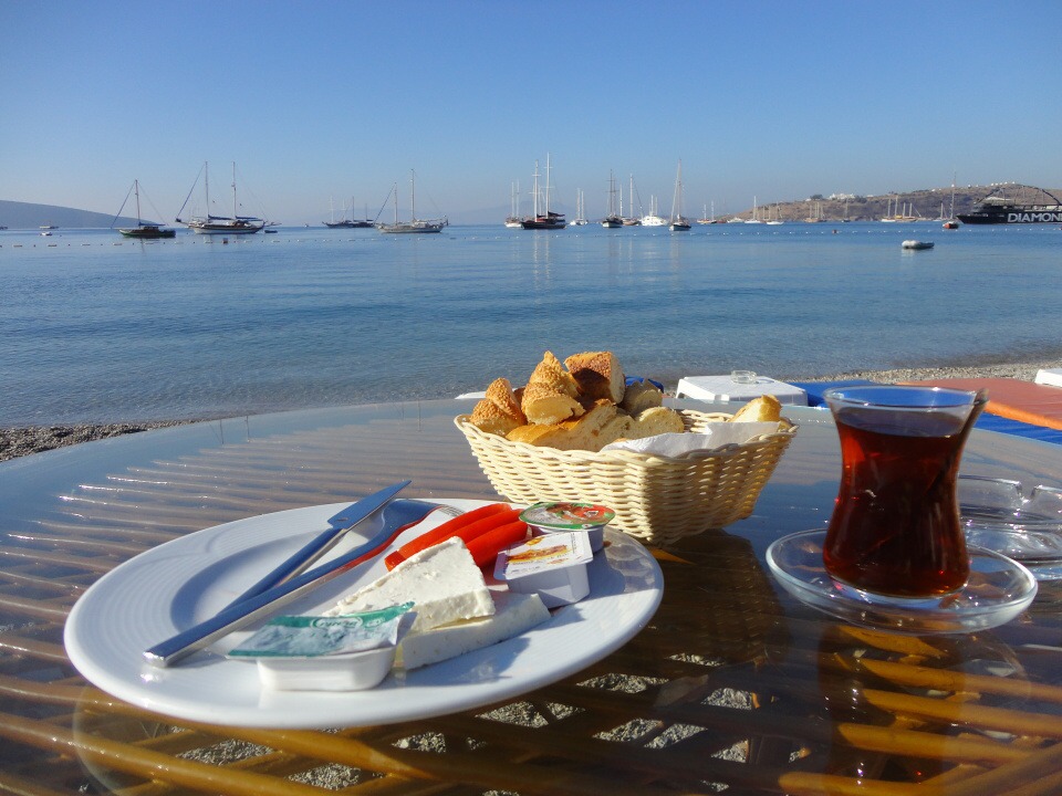 …zážitkem pro mne bylo například hned první ráno, kdy jsem jako jedna z posledních dorazila na snídani. Snídaně se totiž nekonala v restauraci hotelu, ale servírovala se přímo u stolů na pláži, kde jsme snídali každé ráno. Bylo to tak úžasné snídat na pláži při východu slunce a pozorovat, jak Bodrum i přístav vstává, že jen při vzpomínce na to je mi velmi smutno….
