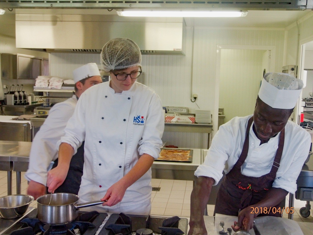 Okolí Peyregoux je krásná venkovská oblast se spoustou malebných středověkých městeček a vesniček, které si Francouzi chrání a zachovávají jejich charakter a styl. Uvítali nás srdečně. Jsme ubytovaní v renovované klášterní budově, která slouží jako internát. Pracovní stáž jsme nastoupili v hotelu Le Caussea. Vyzkoušeli jsme si práci pokojských, práci v kuchyni i v restauraci jako obsluha. Všichni jsou na nás moc milí. Paní učitelka se nám snaží s jazykem pomáhat, přece jen někteří z nás začali francouzštinu studovat teprve vloni v září, ale taky nás nechá, abychom se prokousali tímto krásným jazykem samostatně. Vždy si nás prozkouší a zeptá se na jednotlivé výrazy, které jsme se za den naučili jak v kuchyni, tak na „ place“. Anglicky na nás v hotelu mluví jen trochu, po krátké chvilce stejně vše spadne do francouzštiny, a tak chytáme slovíčka a fráze jako o závod. Naši hostitelé z M.F.R. se o nás starají skvěle. Vařili jsme celé francouzské menu a obsluhovali jejich klienty. Dále se učíme jejich cukrařině, která je opravdu vytříbená a chutná. Docela se nám jejich dezerty daří vyrábět.