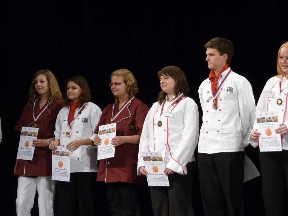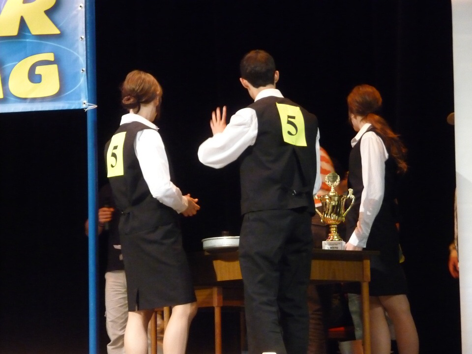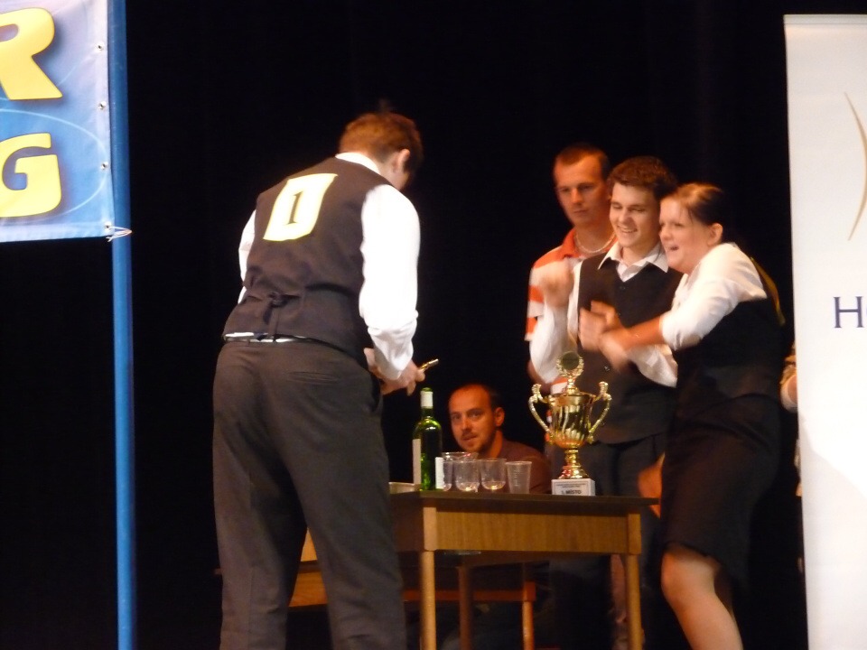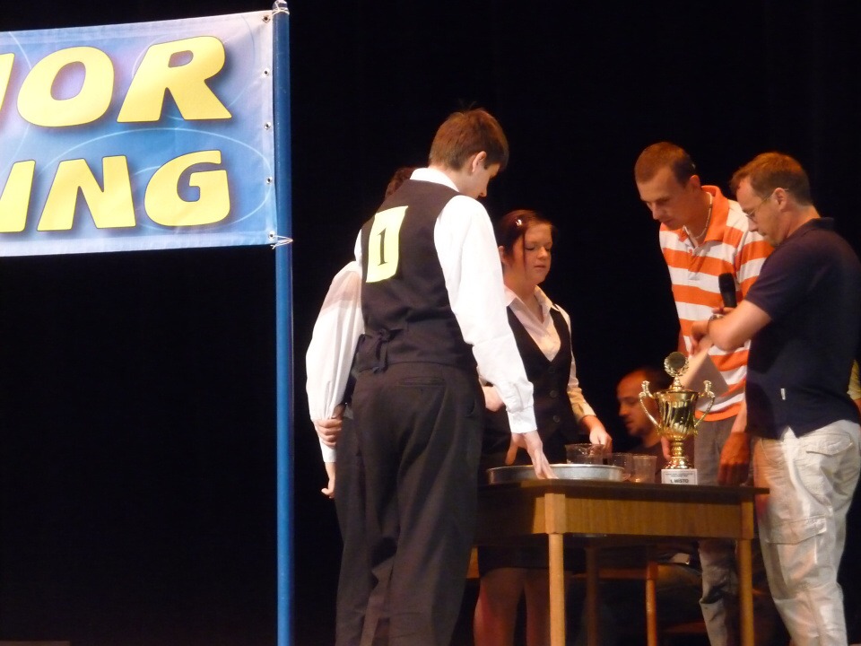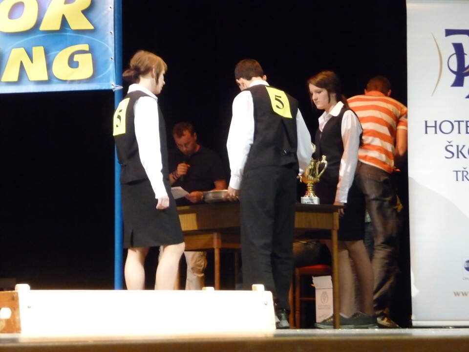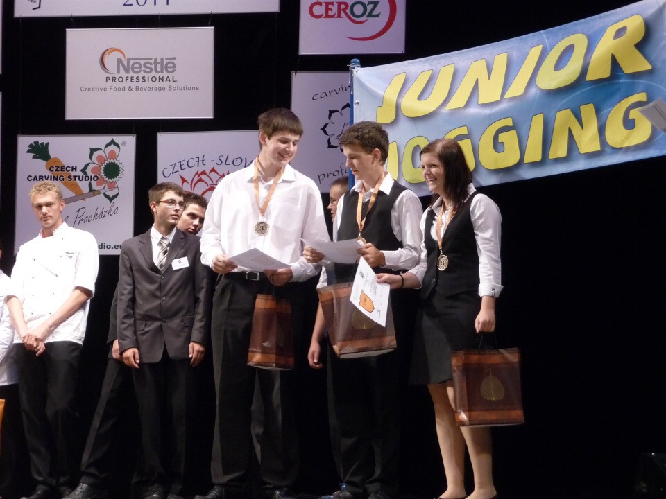 Naši školu pilně zastupovali i studenti v junior joggingu, což je běh číšníků s vínem. Této soutěže se od nás účastnili 2 týmy po třech. První tým se skládal z Jana Krčmaříka, Péti Kožíškové a Lukáše Rozkydala. Druhý tým tvořil Adam Glemba, Verča Vaisová a Zuzka Hoskovcová. Úkolem číšníků bylo v co nejkratším čase otevřít láhev vína, zdolat překážky s plným kelímkem a rozlít minimální množství vína.. I zde jsme uspěli a umístili se na třetím místě.