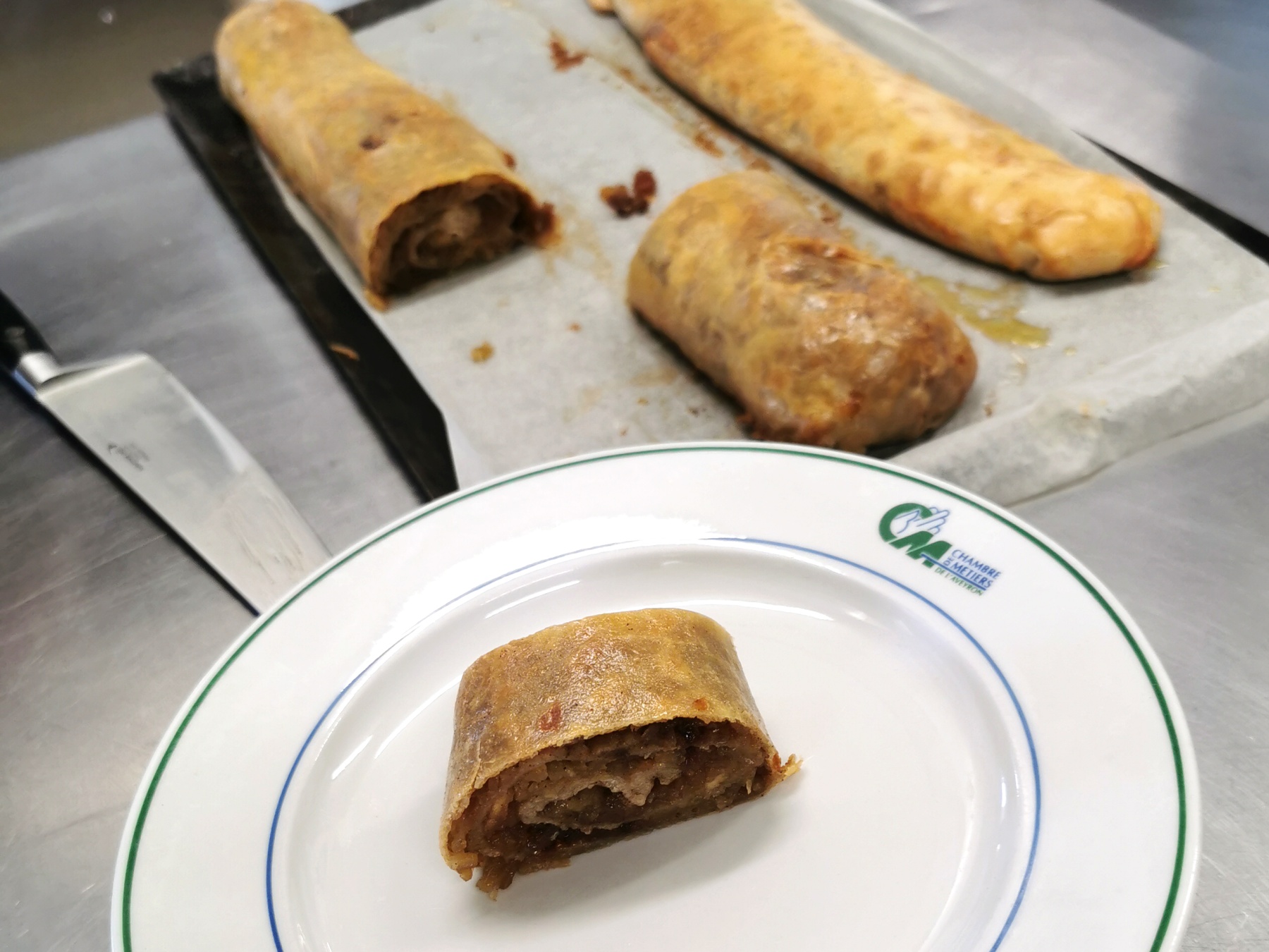 Naši studenti zjistili, co je to bouquet garni, který potřebovali na klasický francouzský pokrm Blanquette de veau, což je telecí ragú v bílé omáčce. A všichni si budou pamatovat, že Tarte Tatin se musí péct obráceně, jablky vespod. Zkaramelizovaná jablka chutnají báječně! Francouzi překonali nástrahy přípravy knedlíků a zvládli je prý na jedničku. A štrúdl byl prý délicieux!