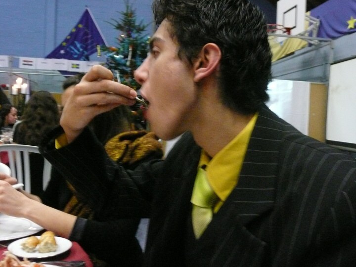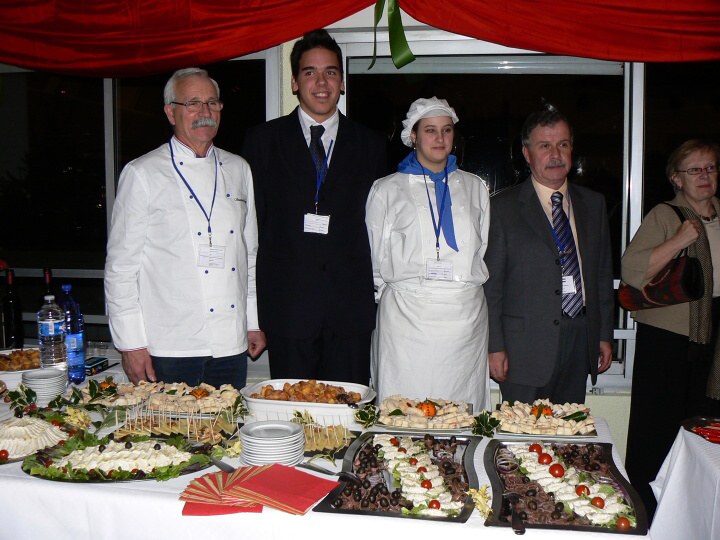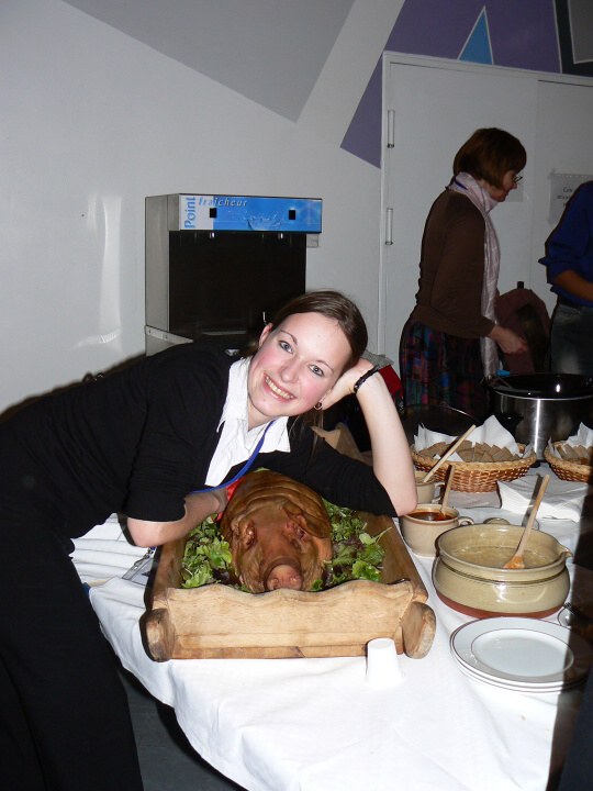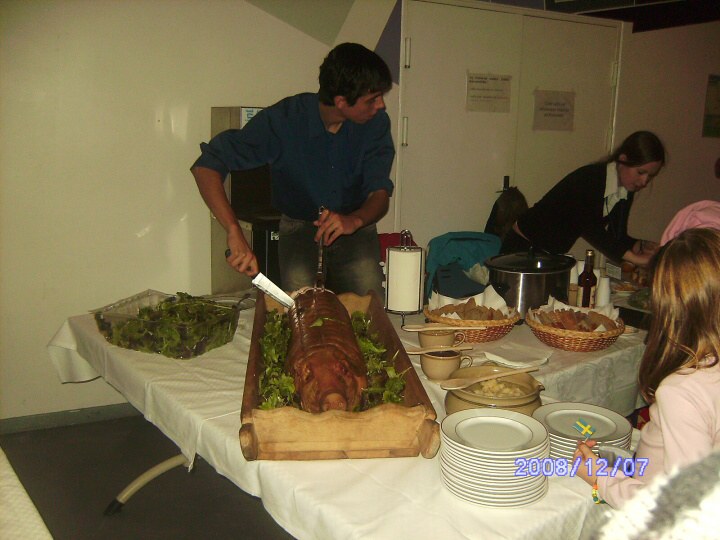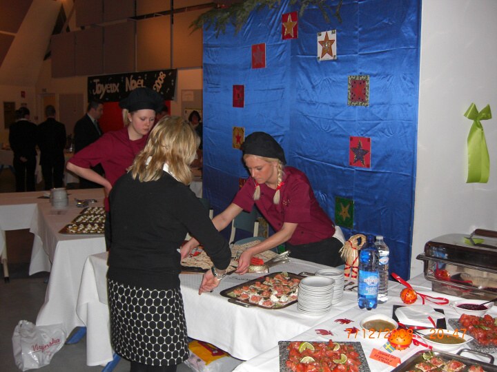 V pondělí jsme stále vystavovali až do odpoledních hodin. Navštívila nás spousta škol a školek. V šest hodin jsme stánek sbalili, vše uklidili a přesunuli se do školy na raut připravený společnými silami. Každá škola nachystala svou vánoční specialitu na rautovou tabuli. My jsme ostatním studentům nabídli sele se švestkovou omáčkou, křenem s jablky a k pití svařenou medovinu s kořením. Ochutnali jsme spoustu zajímavých národních pokrmů.