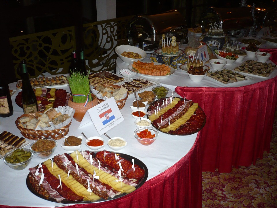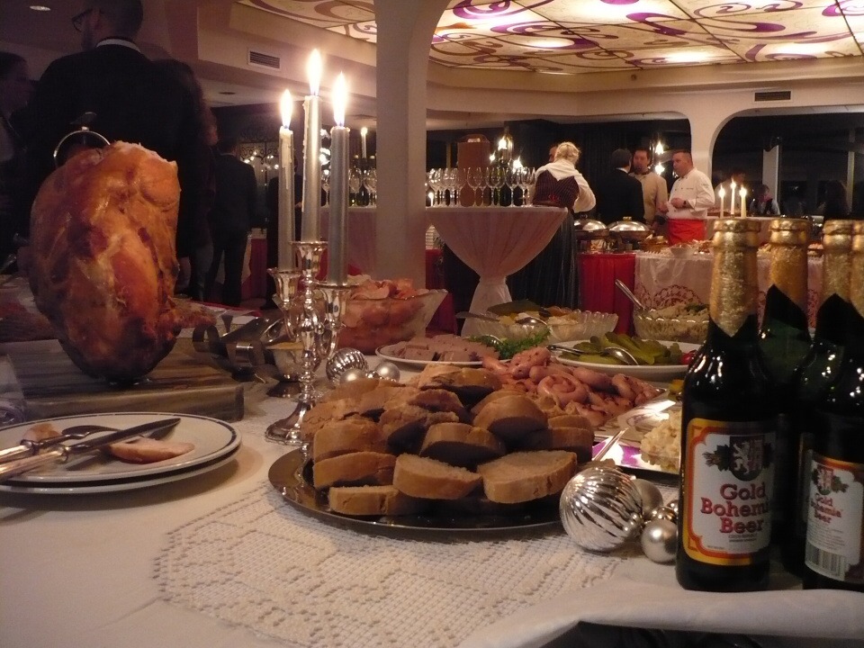 Na slavnostním rautu s nabídkou českých jídel, piva a becherovky jsme nejen doporučovali ty naše, ale i ochutnávali tradiční vánoční pokrmy a nápoje všech zemí a nechyběl ani kulturní program plný vánočních koled a národních tanců.